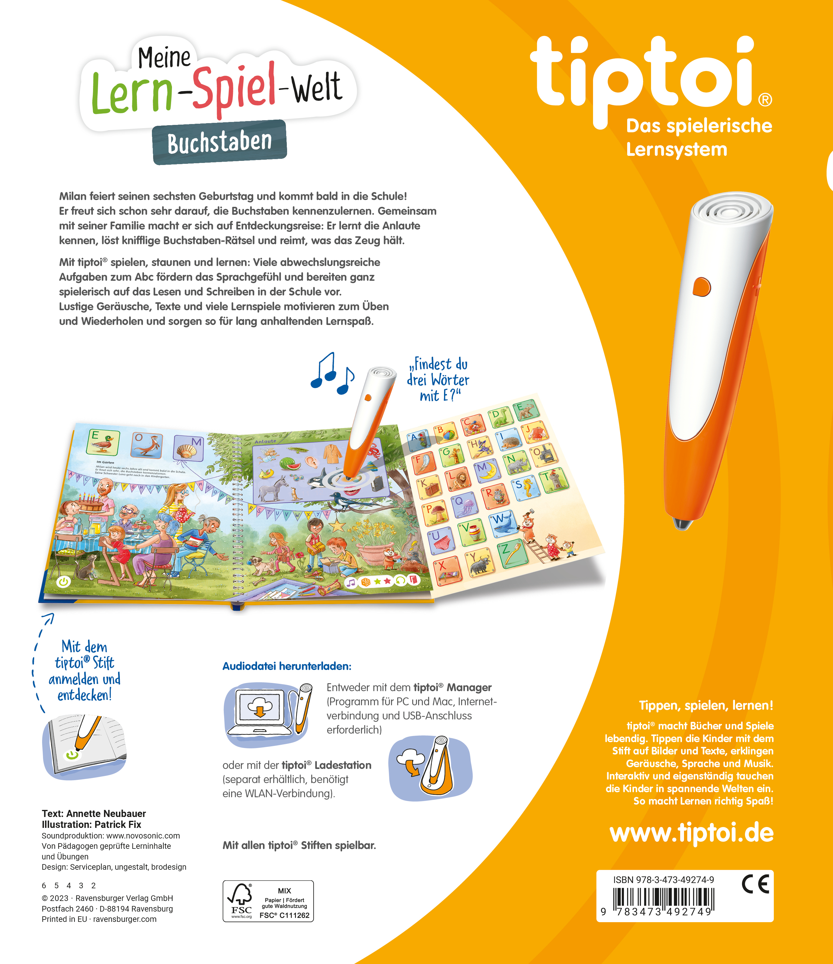 Die Kinder begleiten Milan und seine Schwester Lena auf den Waldspielplatz, ins Naturkundemuseum, an den See und auf den Bauernhof. Dabei lernen sie die verschiedenen Buchstaben kennen. In vielen lustigen Spielen üben sie das Hören von Lauten und die Verknüpfung von Laut und Buchstabe. So fördert tiptoi das Sprachgefühl und bereitet die Kinder optimal auf das Lesen und Schreiben vor.