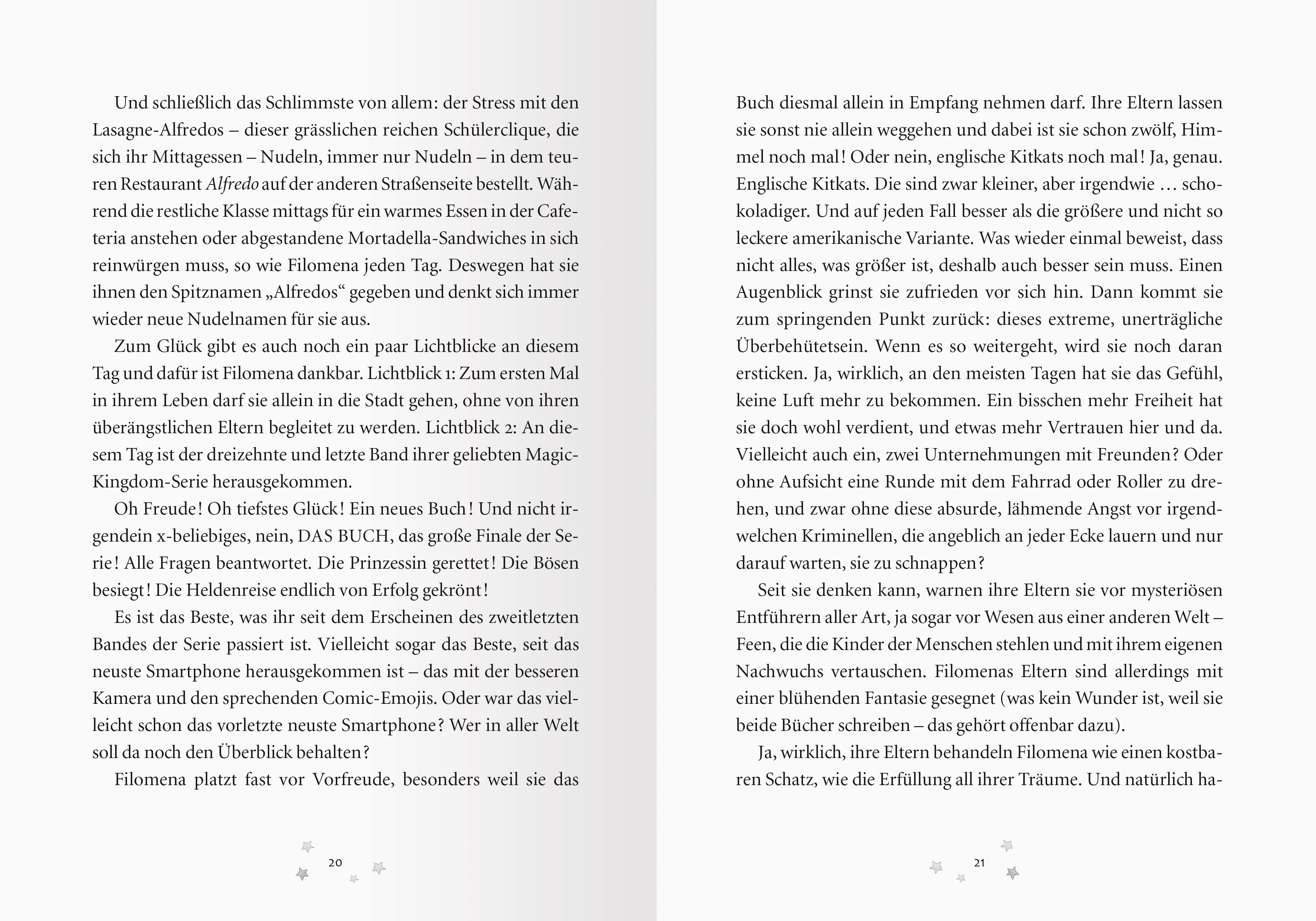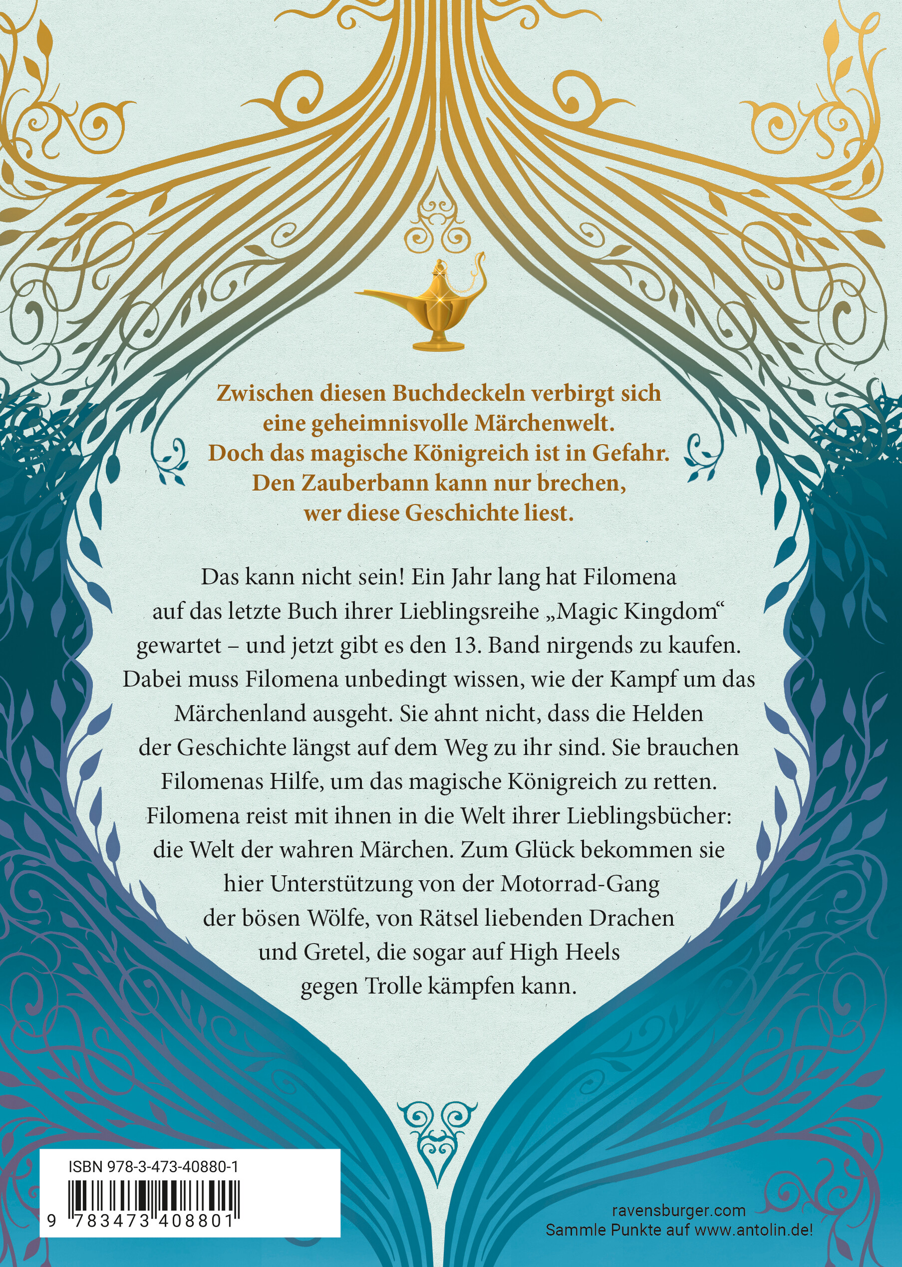 Ein Jahr hat Filomena auf das Finale ihrer Lieblingsreihe "Magic Kingdom" gewartet - jetzt gibt es das 13. Buch nirgends zu kaufen! Dabei muss Filomena wissen, wie der Kampf um das Märchenland ausgeht! Doch die Helden der Geschichte sind auf dem Weg zu ihr und nehmen sie mit in die Welt ihrer Lieblingsbücher: die Welt der wahren Märchen. Um das Königreich zu retten, bekommen sie Unterstützung von der Motorrad-Gang der bösen Wölfe und Gretel, die sogar auf High Heels gegen Trolle kämpfen kann.