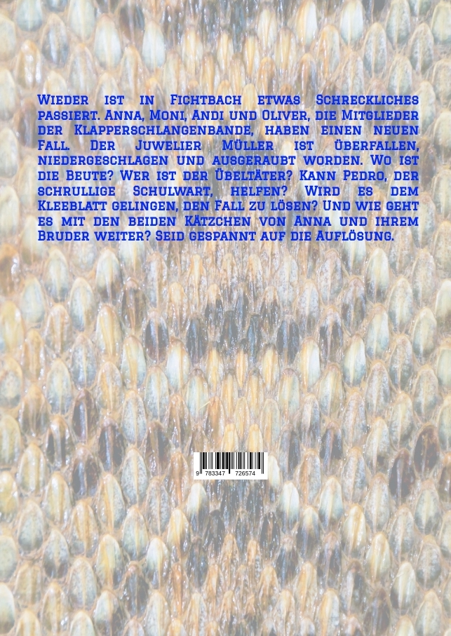 | Schlagworte | 10 Jahre • 11 - 13 Jahre • 8 Jahre • 9 Jahre • Abenteuer • Bande • Chemie • Club • Detektive • Detektivgeschichte • DNA • DNS • Drache • Familie • Fichtbach • Fingerabdrücke • Forensik • Geister • gesichtsloser Förster • Großdruck • Groß-Schrift • Grundschüler • Haaranalyse • Humor • Hund • Juwelier • Katze • Katzenbabys • Keller • Kids • Kinderschar • Klub • Klubhaus • Labor • Lesevergnügen • Oma • Opa • Polizei • Raub • Schulwart • sehbeeinträchtigt • sehschwach • spannend • Spannung • Spital • Überfall • Unterhaltsam • Verbrecher • verschiedene Familiensetuationen • Weiße Frau • Zusammenhalt |