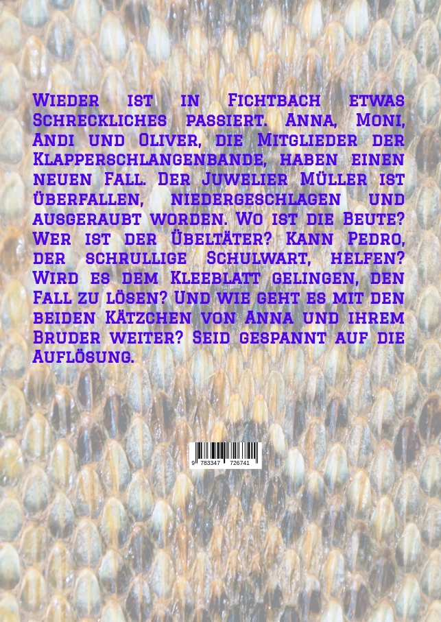 | Schlagworte | 10 Jahre • 11 - 13 Jahre • 8 Jahre • 9 Jahre • Abenteuer • Bande • Chemie • Club • Detektive • Detektivgeschichte • DNA • DNS • Drache • Familie • Fichtbach • Fingerabdrücke • Forensik • Geister • gesichtsloser Förster • Großdruck • Groß-Schrift • Grundschüler • Haaranalyse • Humor • Hund • Juwelier • Katze • Katzenbabys • Keller • Kids • Kinderschar • Klub • Klubhaus • Labor • Lesevergnügen • Oma • Opa • Polizei • Raub • Schulwart • sehbeeinträchtigt • sehschwach • spannend • Spannung • Spital • Überfall • Unterhaltsam • Verbrecher • verschiedene Familiensetuationen • Weiße Frau • Zusammenhalt |