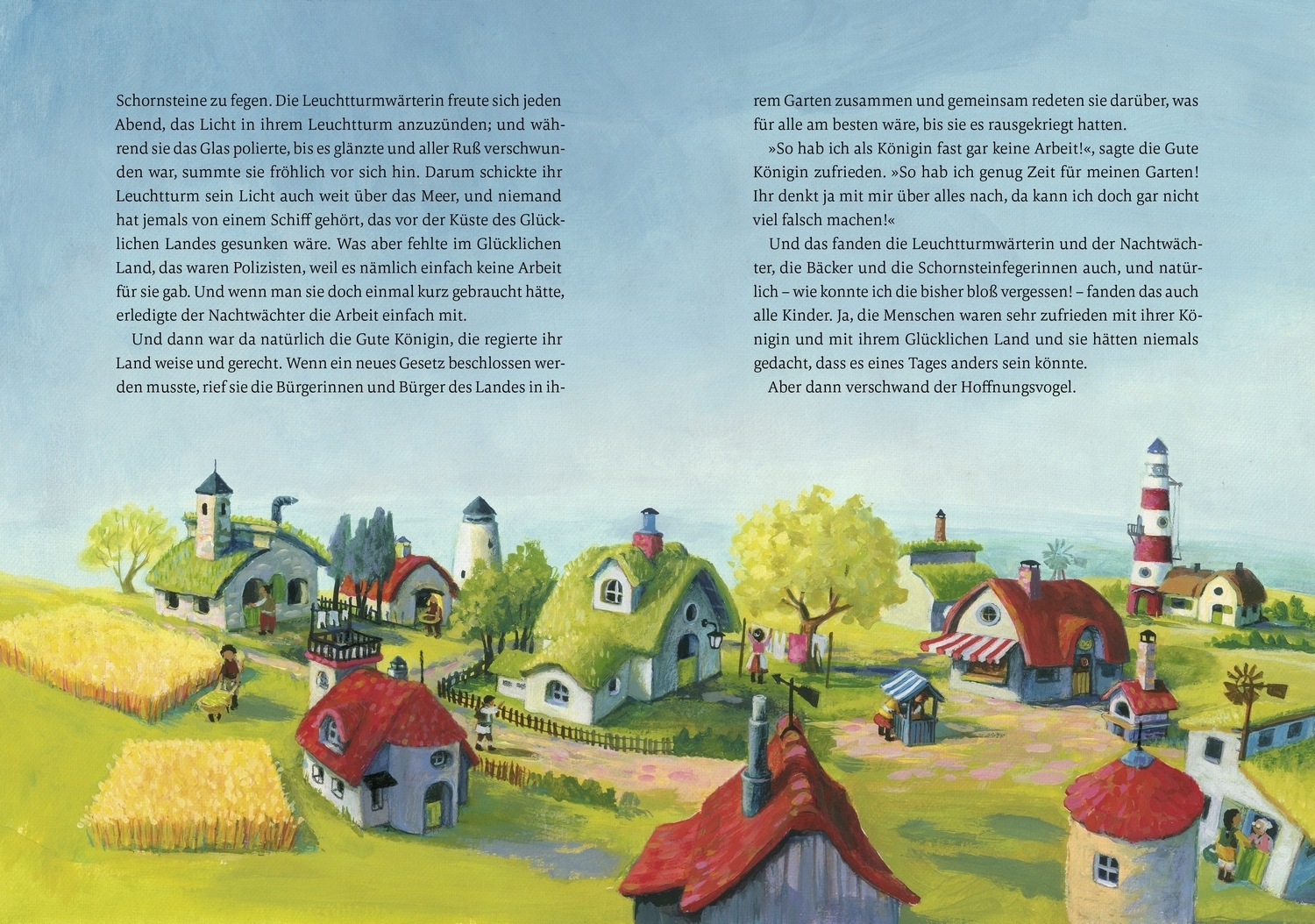 Jabu und seine Mutter, die gute Königin, leben im Glücklichen Land in der königlichen Kate. Wann immer es Entscheidungen zu treffen gilt, kommt das Volk in ihrem Garten zusammen. Eines Tages aber mehren sich Zank und Missgunst unter den Menschen: Der Hoffnungsvogel singt nicht mehr über dem Glücklichen Land. Nun ist es an Jabu, ihn zurückzuholen. Die Aufgabe macht Jabu Angst und er ist froh, dass Alva, die Tochter der Leuchtturmwärterin, ihn begleitet. Mit einem alten Schiff, fahren die Kinder weit übers Meer, um den Hoffnungsvogel zu suchen. Auf ihrer abenteuerlichen Mission sind es nicht etwa Schwerter und Waffen, die sie stark machen, sondern eine kleine, tröstliche Melodie, die ihnen Alvas Mutter mit auf die Reise gegeben hat. Der Roman von Kirsten Boie ist ein vielschichtiges, zeitgemäßes und kluges Märchen. Es erzählt von der Hoffnung, dass eines Tages alle Menschen friedlich miteinander leben sowie von der Kraft des Verzeihens und der Güte, mit der wir einander retten könnten.