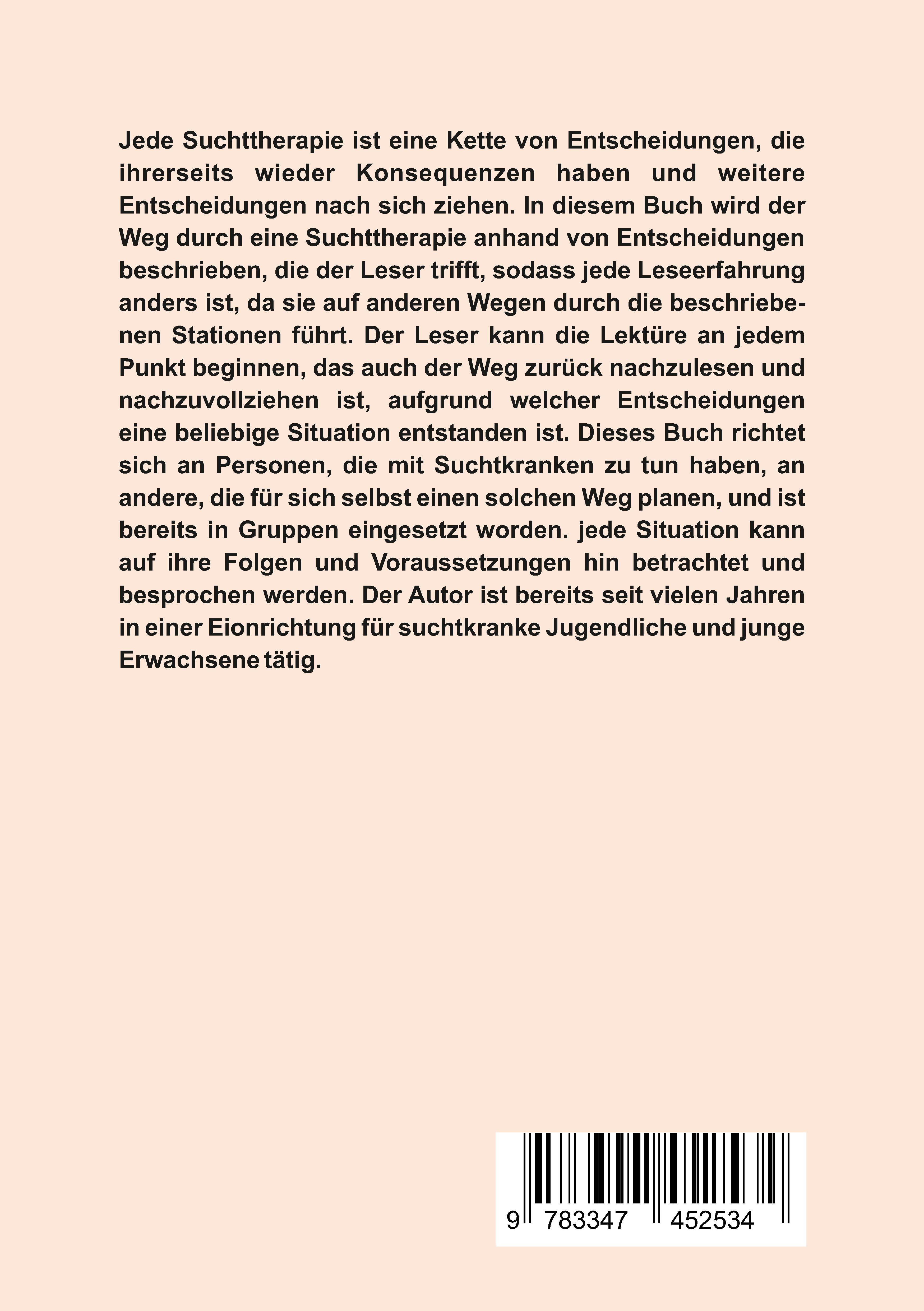 In diesem Buch geht es um eine Suchttherapie bei Jugendlichen. Da die Therapie vor allem aus Entscheidungen besteht, folgt der Leser den täglichen Anforderungen wie in einem Spielbuch und wird dabei direkt angesprochen, um sich in alles gut hineinversetzen zu können. Alle geschilderten Situationen kommen in praktisch jeder Suchttherapie vor: wie umgehen mit Geheimnissen und Lügen, mit Betrug und Selbstbetrug, mit Erfolgen, Versagen und Misserfolgen, mit Freunden, Feinden, falschen Freunden, mit Träumen und Erinnerungen? Das Ziel ist ein selbstbestimmtes Leben, aber manchmal ist es fast zu schwer. Doch entdeckt der Leser auch die Kraft, die in jedem steckt, und die es in der Therapie zu entdecken und zu entwickeln gilt. Am Ende kann sich jeder sagen: Du hast es für Dich selbst getan, und darum hast Du es schließlich geschafft.