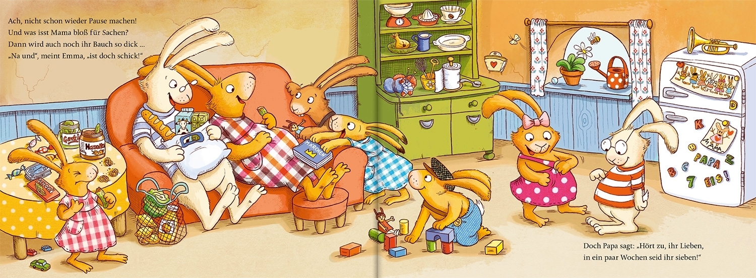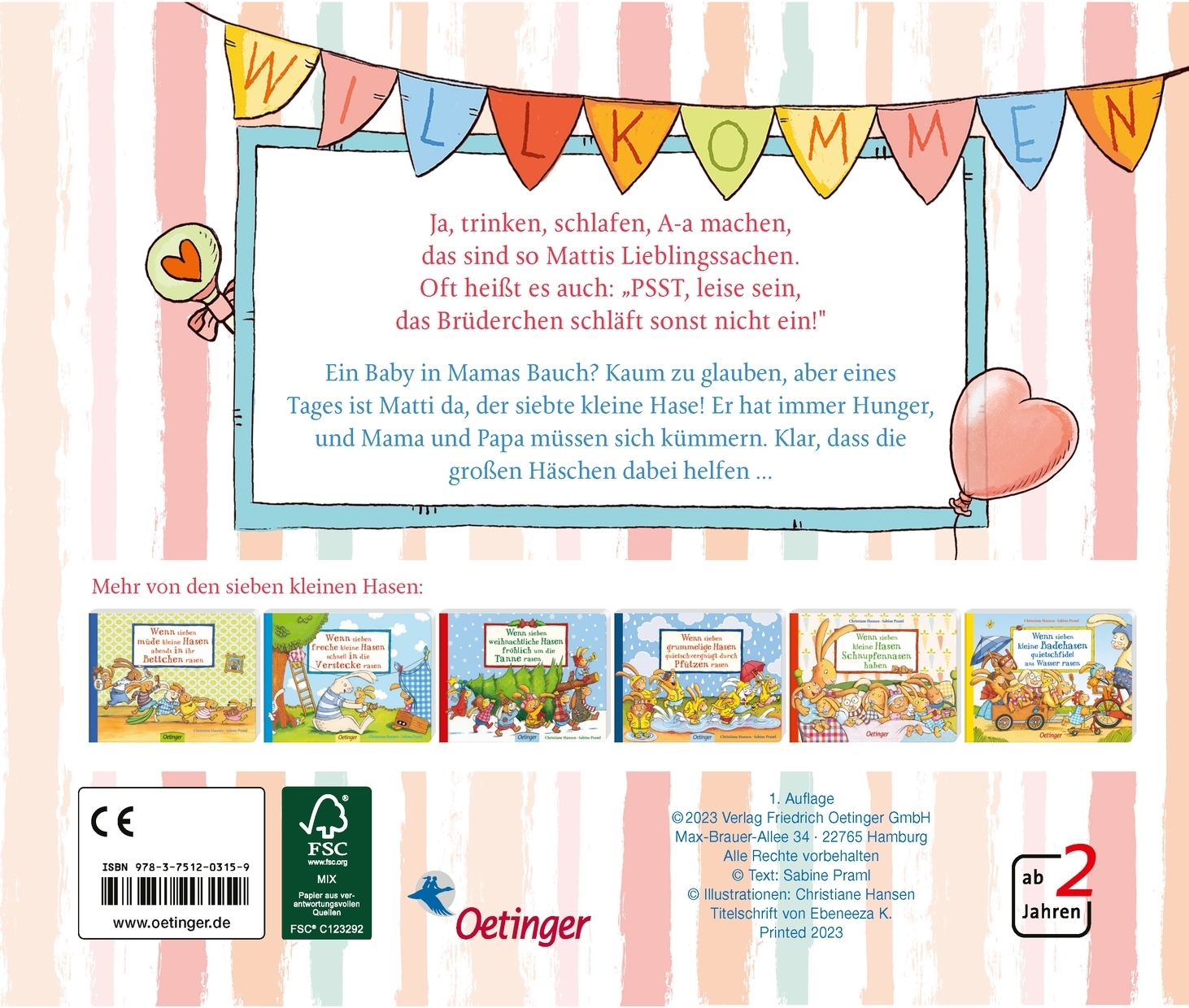 Familie Hase erwartet Nachwuchs. Tom und Titus, Valentin, Emma, Frieda und Fienchen sehen jeden Tag, wie Mama immer dicker wird. Gespannt legen sie ihrer Mama die Hand auf ihren Bauch und fühlen manchmal auch, wie sich ihr kleines Geschwisterchen schon bewegt. Und dann ist Matti endlich da. So eine Freude! Doch jetzt müssen die Häschen lernen, dass Mama und Papa weniger Zeit haben. Wie gut, dass die kleinen Hasen alle schon so prima helfen können.