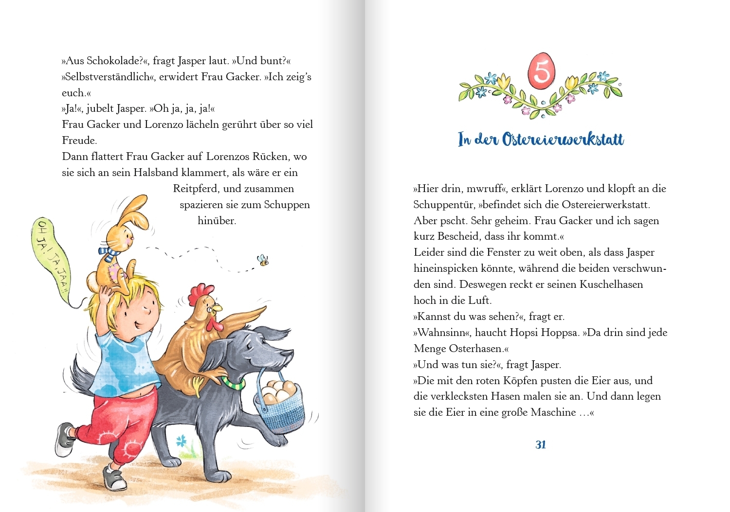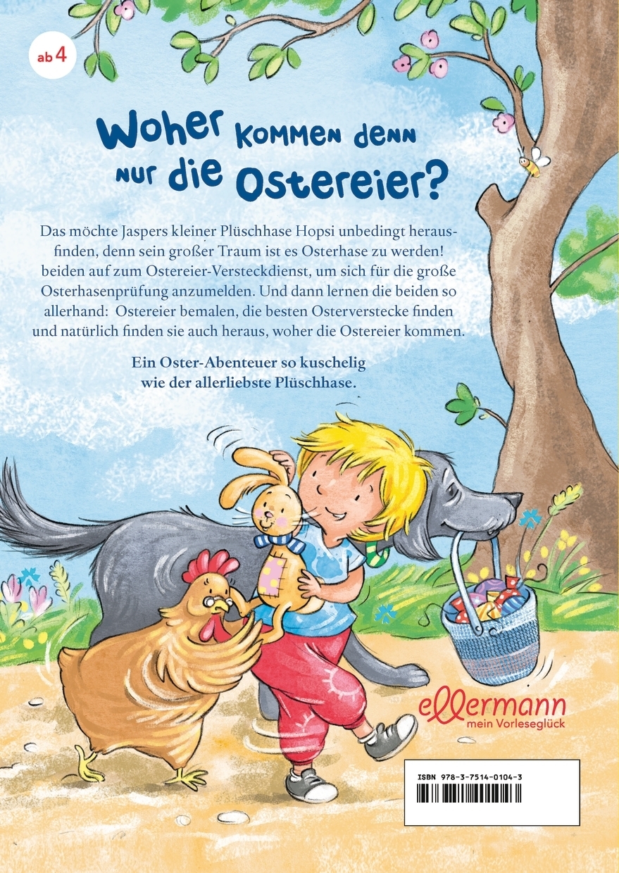 Jaspers kleiner Plüschhase Hopsi möchte unbedingt Osterhase werden! Jasper ist fest entschlossen, ihm dabei zu helfen. Also machen sich beiden auf zum Ostereier-Versteckdienst, um sich für die große Osterhasenprüfung anzumelden. Frau Gacker ist zunächst skeptisch, denn schließlich ist Hopsi ein Plüschhase. Doch Hopsi und Jasper lernen eifrig, was ein Osterhase alles so können muss - Ostereier bemalen, die besten Osterverstecke finden und natürlich finden sie auch heraus, woher die Ostereier kommen. Aber ob das zum Bestehen der Osterhasen-Prüfung reicht?