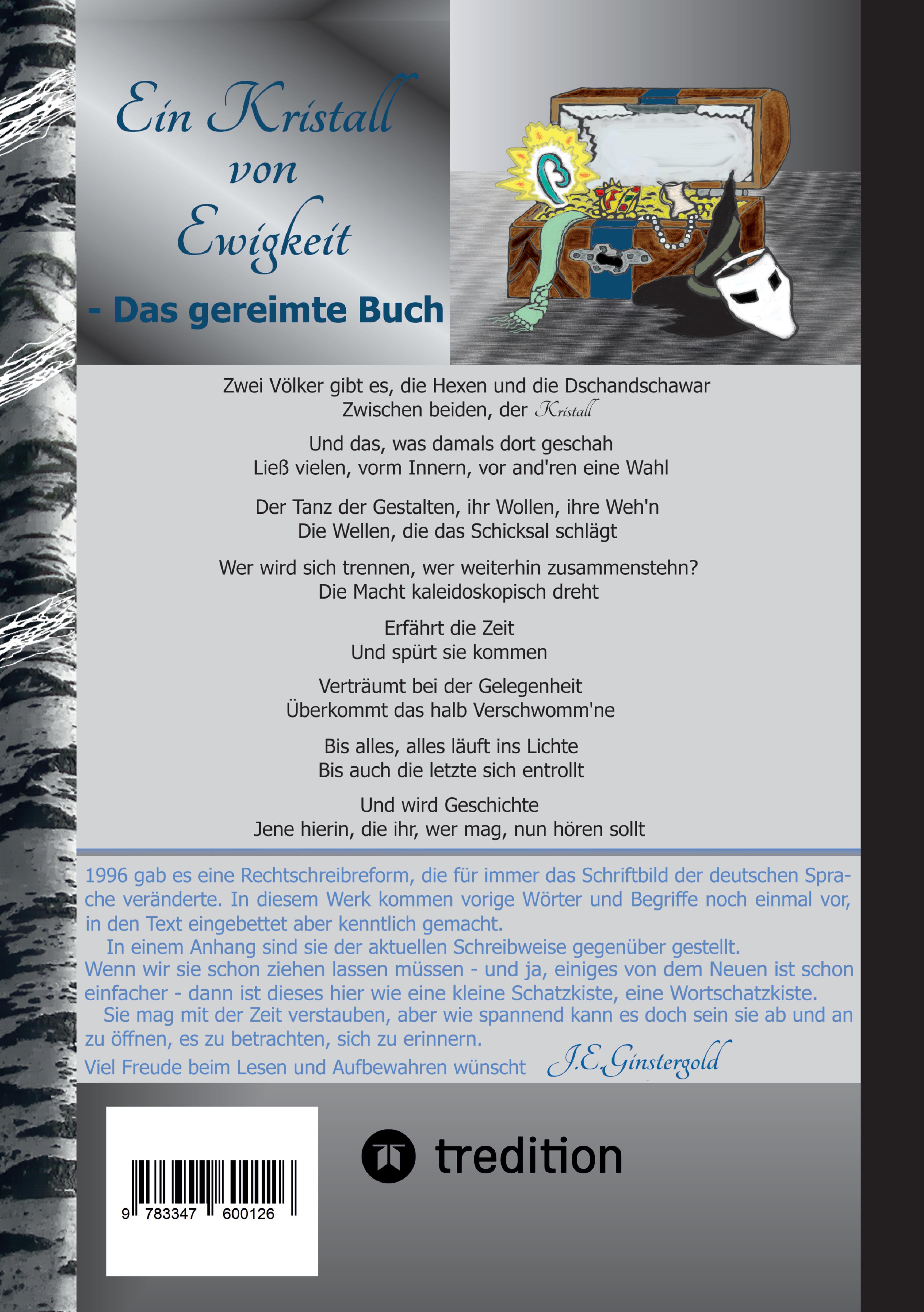 Das gereimte Buch. / Die kleine Hexe Flix macht sich auf die Reise - denn die Oberhexe hat sich als böse entpuppt. Diese will die Hexen in eine Falle locken und bekommt dafür den KRISTALL von EWIGKEIT. / Niemand glaubt dem Hexenkind und so endet die große Versammlung im Norden in einem Desaster. / Flix kann fliehen. Wie sie erfährt, soll es bald im Süden das nächste Treffen geben. Schafft sie es dieses Mal die Hexen rechtzeitig zu warnen? Das gereimte Buch ist auch eine SCHATZKISTE für die deutsche Rechtschreibung. / Die Wörter, für die es vor 1996 noch andere Regelungen gab, sind im Text kenntlich gemacht. / Im Anhang gibt es eine Tabelle, um sie mit der heutigen Schreibweise zu vergleichen. / Viel FREUDE beim LESEN und AUFBEWAHREN wünscht J.E.Ginstergold
