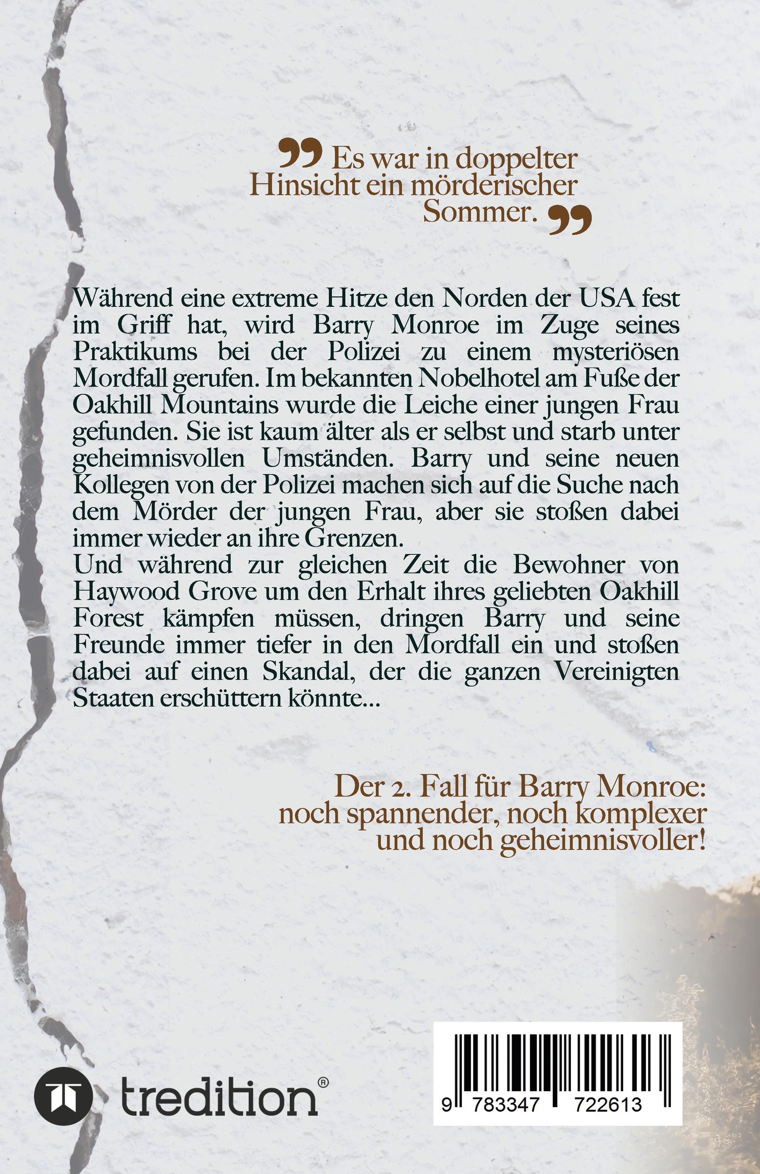 "Es war in doppelter Hinsicht ein mörderischer Sommer."Während eine extreme Hitze den Norden der USA fest im Griff hat, wird Barry Monroe im Zuge seines Praktikums bei der Polizei zu einem mysteriösen Mordfall gerufen. Im bekannten Nobelhotel am Fuße der Oakhill Mountains wurde die Leiche einer jungen Frau gefunden. Sie ist kaum älter als er selbst und starb unter geheimnisvollen Umständen. Barry und seine neuen Kollegen von der Polizei machen sich auf die Suche nach dem Mörder der jungen Frau, aber sie stoßen dabei immer wieder an ihre Grenzen. Und während zur gleichen Zeit die Bewohner von Haywood Grove um den Erhalt ihres geliebten Oakhill Forest kämpfen müssen, dringen Barry und seine Freunde immer tiefer in den Mordfall ein und stoßen dabei auf einen Skandal, der die ganzen VereinigtenStaaten erschüttern könnte...Der 2. Fall für Barry Monroe: noch spannender, noch komplexer und noch geheimnisvoller!