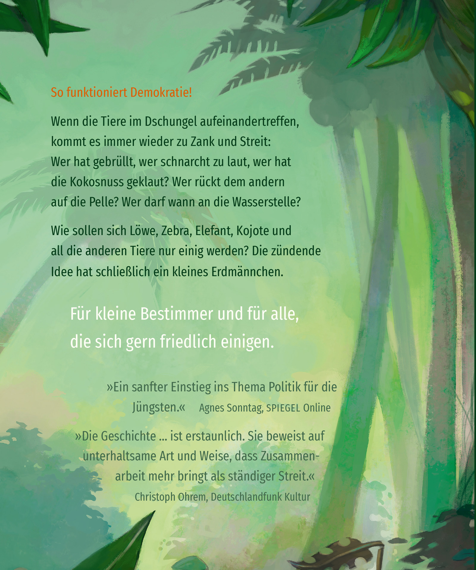 Das erfolgreiche Bilderbuch über die Demokratie - jetzt im Miniformat für alle Friedensstifter. Wenn die Tiere im Dschungel aufeinandertreffen, kommt es immer wieder zu Streit. Wer hat gebrüllt, wer schnarcht zu laut, wer hat die Kokosnuss geklaut? Wer rückt dem andern auf die Pelle? Wer darf wann an die Wasserstelle? Wie lässt sich bloß Ruhe in die Tierwelt bringen? Für die Löwen ist das keine Frage, sie wollen Bestimmer sein, weil sie die Zähne fletschen können. Die Zebras rühmen sich als vegetarische Friedensstifter. Und die Elefanten sind sowieso die Größten. Wer soll also die Tierwelt anführen? Die zündende Idee hat schließlich ein kleines Erdmännchen namens Elvis. Denn wer glaubt, die alten Griechen hätten die Demokratie erfunden, irrt gewaltig: Es war Erdmännchen Elvis!