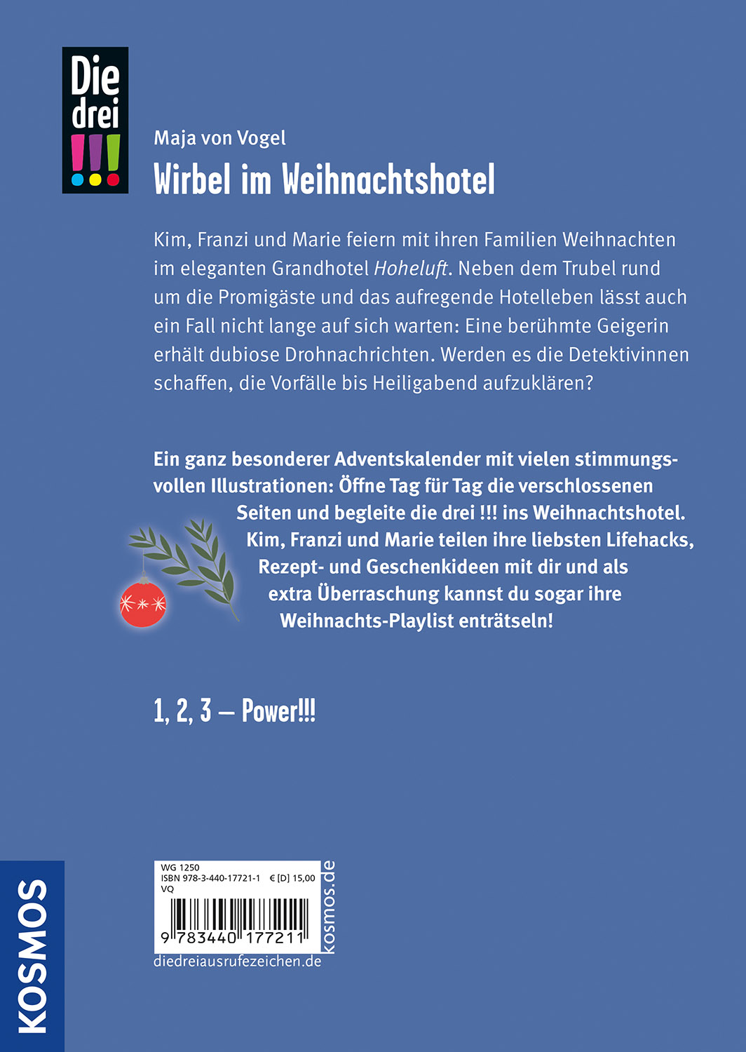 Ein ganz besonderer Adventskalender: Tag für Tag die geheimen Seiten öffnen und die drei !!! durch den Advent begleiten. Für Spannung sorgt der Adventskrimi in 24 verschlossenen Kapiteln: Die drei !!! ermitteln in einem romantischen Weihnachtshotel. Außerdem haben Kim, Franzi und Marie für ihre Fans 24 weihnachtliche Lifehacks und 24 Songs für die Weihnachts-Playlist