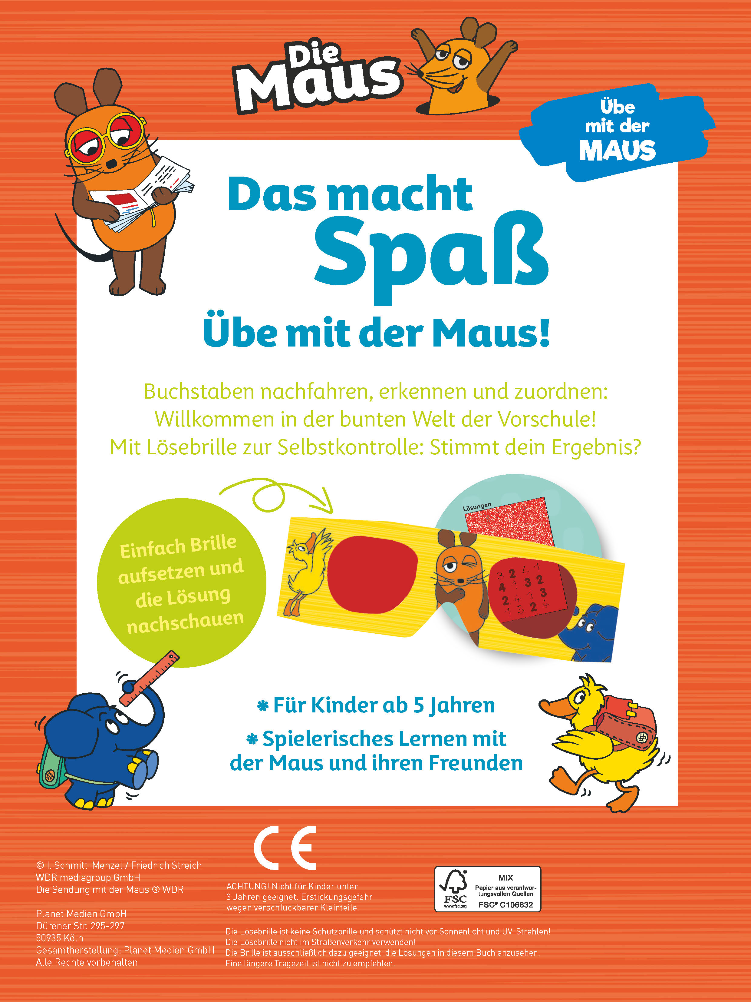 Buchstaben nachfahren, erkennen und zuordnen: Willkommen in der bunten Welt der Vorschule! Erkenne und übe die ersten Buchstaben mit Maus, Elefant & Ente. Mit Lösebrille zur Selbstkontrolle: Stimmt dein Ergebnis? Kunterbunter Lernspaß mit den beliebten Figuren der Sendung mit der Maus.