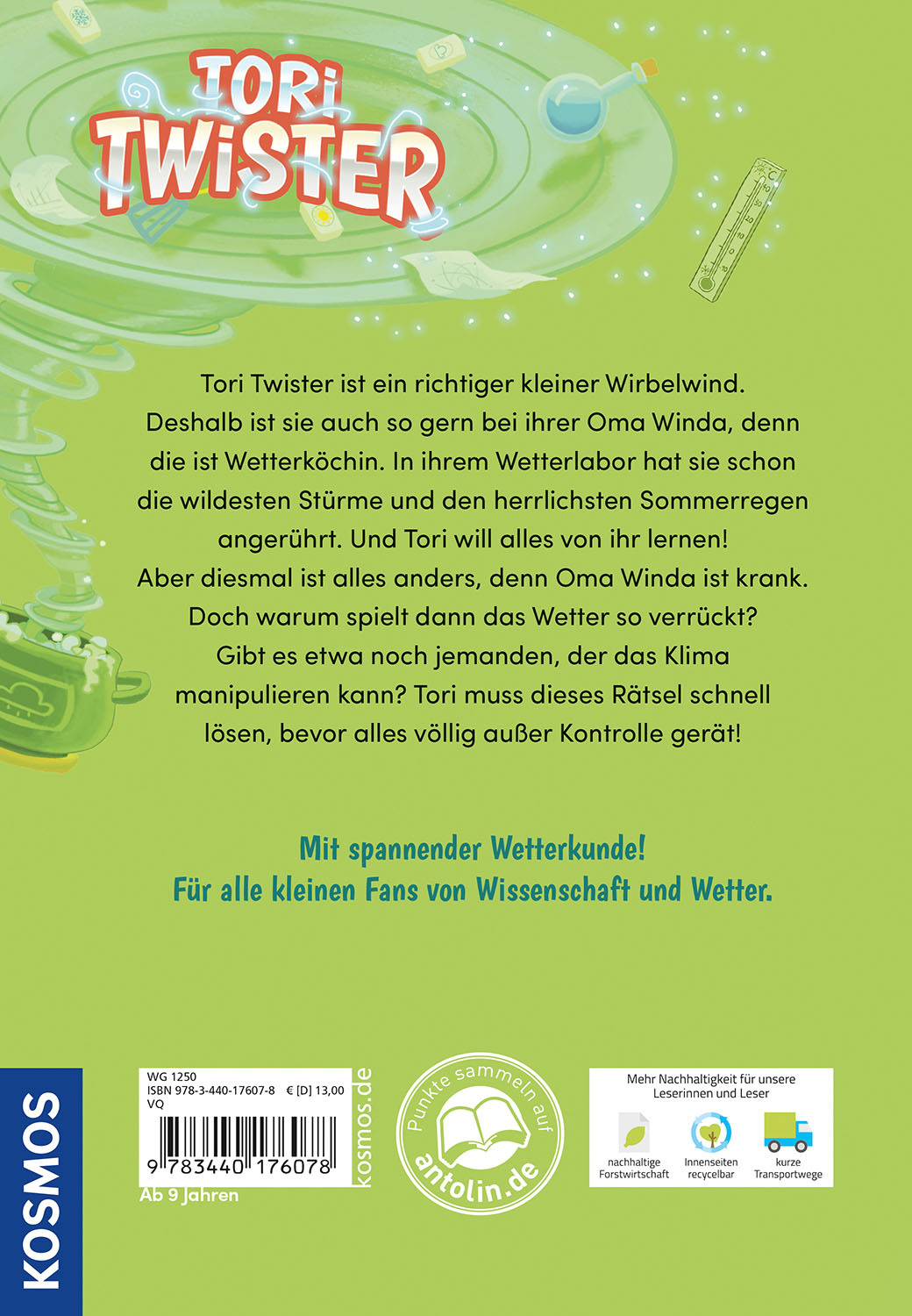 Tori findet Besuche bei ihrer Oma megaspannend. Denn Professorin Windagard Twister ist nicht nur Meteorologin, sondern auch Erfinderin. Ihr Traum ist es, das Wetter zu beherrschen. In Omas Wetterküche brodelt, blitzt und donnert es und tatsächlich hat sie als Wetterköchin erste Erfolge. Doch oft genug geht irgendetwas katastrophal schief. Und nun scheint mit der alternden Dame etwas nicht zu stimmen: Das Wetter ist total außer Kontrolle, besonders seit ein geheimnisvoller Fremder aufgetaucht ist. Kann er etwa auch das Wetter beeinflussen? In dieser Notlage muss Tori das Wettermachen übernehmen, denn nur sie hat ihrer Oma bisher assistiert. Stürmische Zeiten stehen bevor ... Eine turbulente Geschichte mit kindgerechten Infos über Wetter, Klima und Umweltschutz.