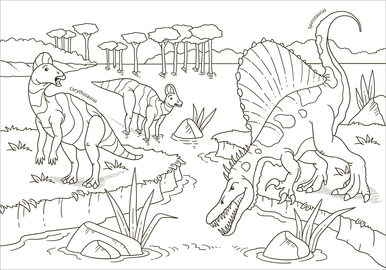 Kämpfende Pachycephalosaurier, ein jagender Dimorphodon, der brüllende Tyrannosaurus Rex oder auch der Unterwasser-Jäger Plesiosaurus - zahlreiche Motive beliebter Dinosaurier und Meeressaurier liefern viel kreativen Ausmalstoff. Die meisten Motive erstrecken sich über eine Doppelseite. Dadurch können auch kleinere Kinder gut ausmalen und ihre motorischen Fähigkeiten verbessern. Durch einige vorkolorierte große Flächen, wie der ockerfarbene Sandboden, das blaue Wasser oder die grüne Wiese, ist das Ausmalen einfacher und macht noch mehr Spaß.