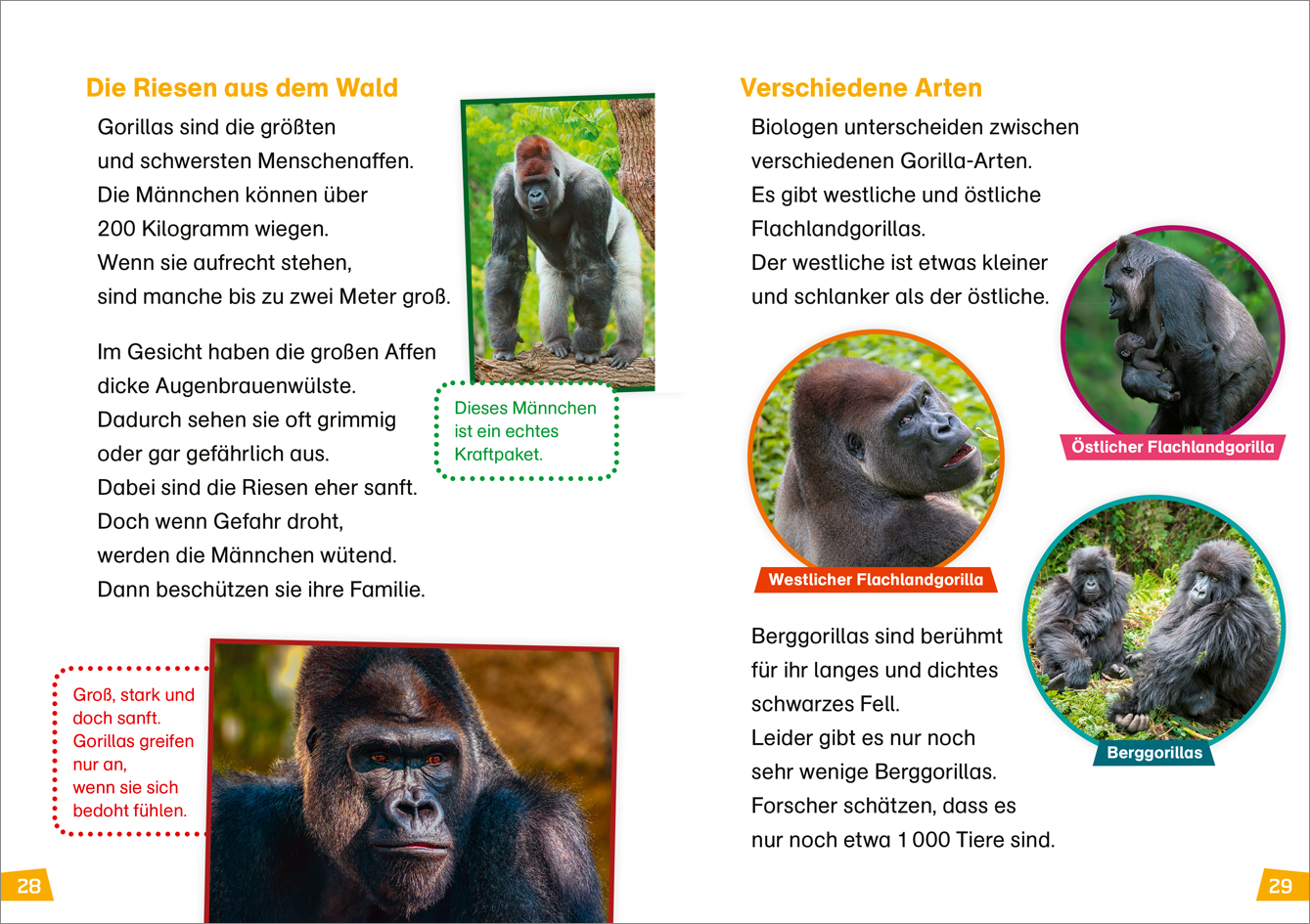 Was sind Menschenaffen? Wie ist ihr Körperbau? Wo leben sie? Und warum wissen wir so viel über diese Tiere? Seite für Seite präsentiert der 22. Band aus der erfolgreichen Erstlesereihe eindrucksvolle Fakten rund um die beeindruckenden Affen. Die große Fibelschrift und ein einfacher Satzbau helfen bei den ersten Leseschritten. Für die nötige Portion Humor sorgt das lustige Schimpansenkind Saba, das die Leseeinsteigerinnen und Leseeinsteiger durch das Buch führt. Am Ende jeden Kapitels gibt es ein kleines Lesequiz. So macht das Lesen lernen noch mehr Spaß!