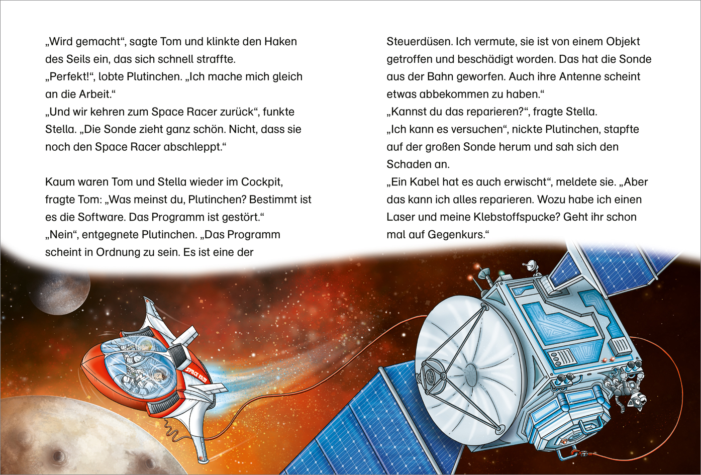 Tom und Stella sind auf dem Mond, als dort die Nachricht eintrifft, dass das Aussetzen eines teuren Forschungssatelliten, der den Pluto umkreisen soll, missglückt ist. Um die Forschungsmission noch zu retten, starten Tom und Stella umgehend durch das Wurmloch zum Pluto, um den aus der Umlaufbahn geratenen Satelliten einzufangen und in den Orbit zurückzubringen. Keine leichte Aufgabe, denn der Pluto hat gleich fünf Monde, deren Anziehungskräfte auf den Satelliten wirken. Eine Slalomfahrt beginnt. Dann wird der Satellit auch noch in Richtung Kuipergürtel geschleudert, wo der Kleinplanet Eris lauert, der noch massereicher ist als Pluto. Am Ende der wilden Jagd können sie den Satelliten einfangen und ihn im Orbit platzieren. Natürlich findet auch eine Landung auf Pluto statt und Plutinchen darf auf ihrem Namensgeber spazieren gehen.