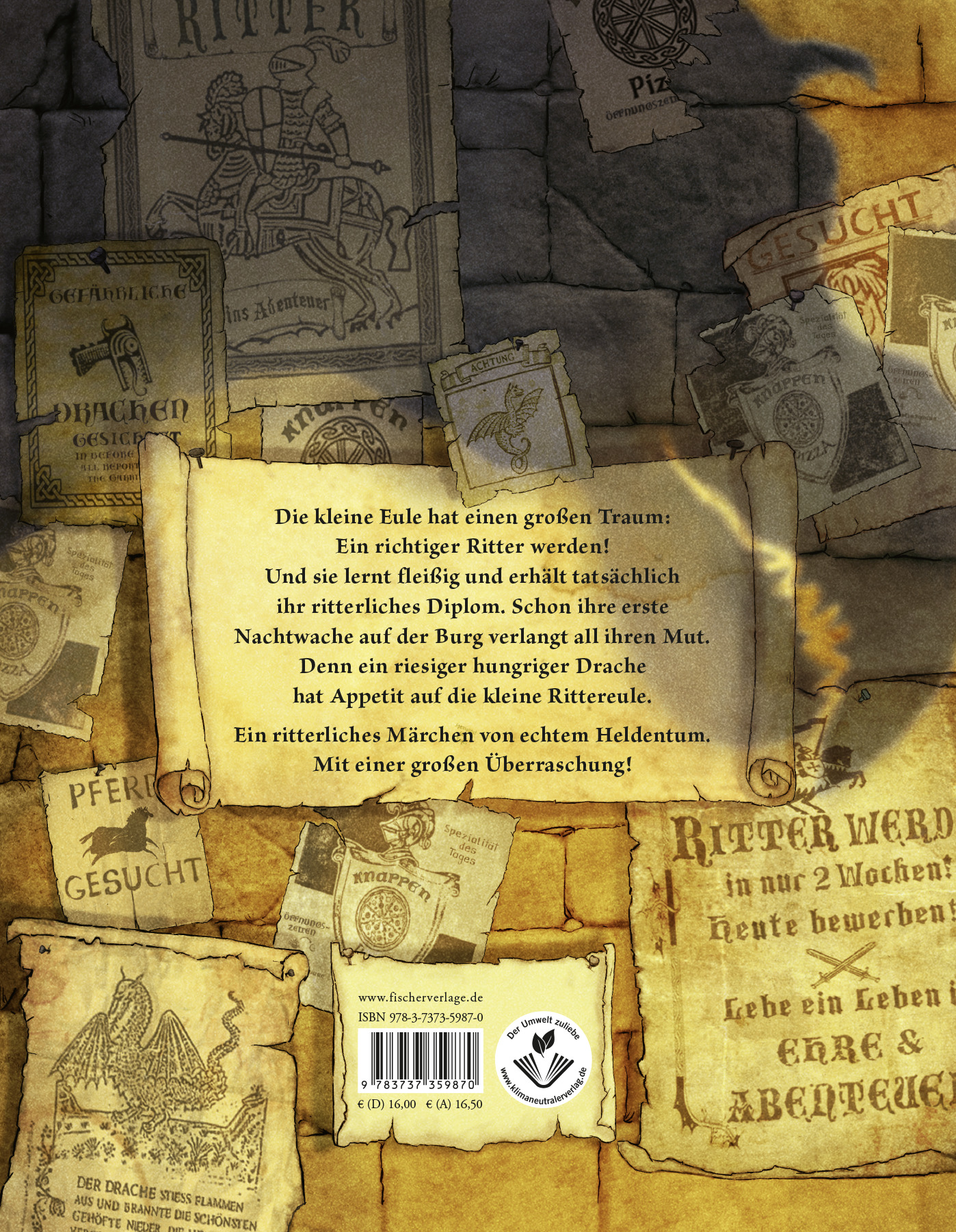 Seit dem Tag an dem er geschlüpft ist, hat er einen großen Traum. Ein echter Ritter sein. Klar, er ist vielleicht nicht die größte und auch nicht die stärkste Eule. Aber sein wacher Verstand und sein Euleninstinkt bewahren alle anderen Ritter davor, in große Gefahr zu geraten. Denn schon während seiner ersten Nachtwache ist die kleine Rittereule vor eine große Herausforderung gestellt. Ein furchterregender hungriger Drache hat ausgerechnet Appetit auf ihn. Aber die kleine Rittereule ist echt clever und hat eine rettende Idee. Wie gut, dass der Drache lieber Pizza isst, als Ritter in ihren Rüstungen.