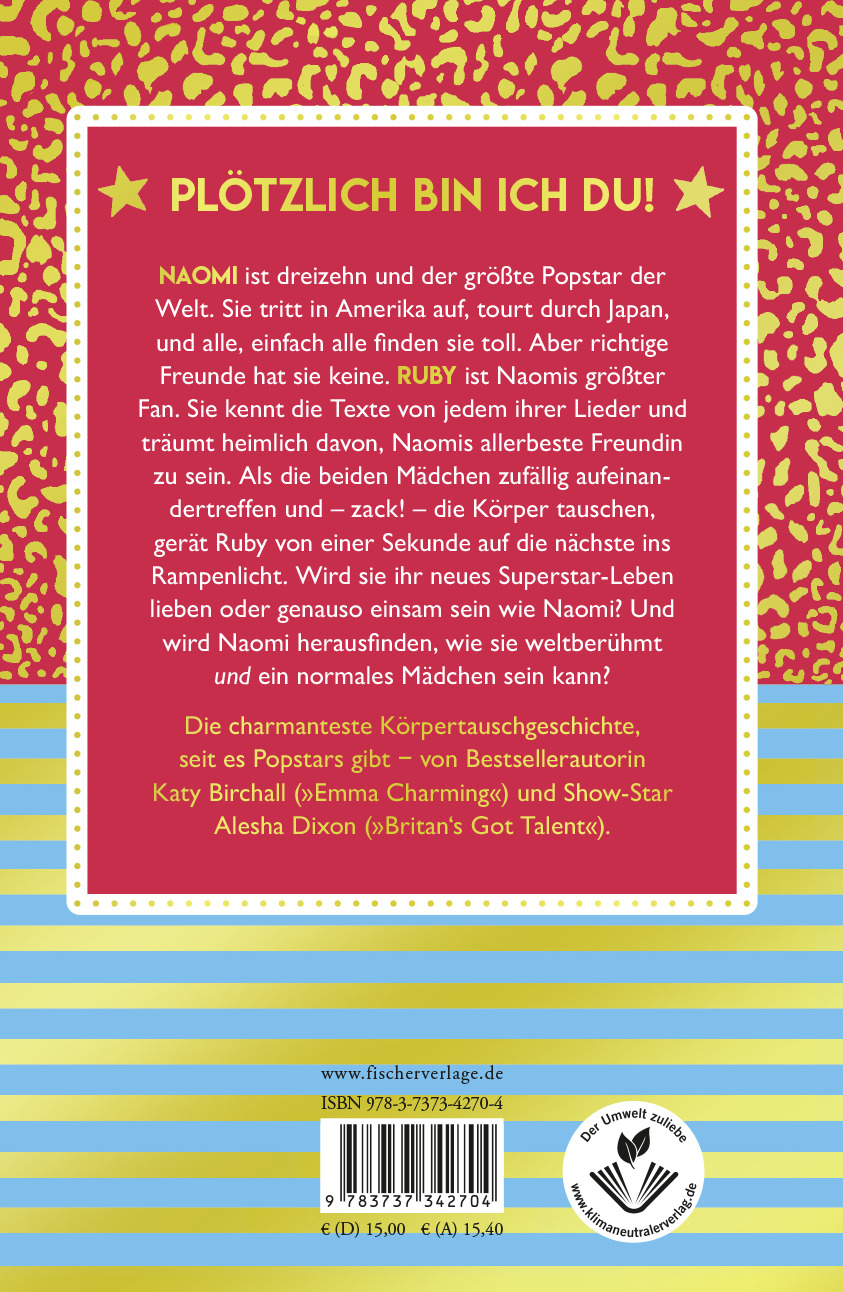 Naomi ist dreizehn und der größte Popstar der Welt. Sie tritt in Amerika auf, tourt durch Japan, und alle, einfach alle finden sie toll. Aber richtige Freunde hat sie keine, und wenn sie mal shoppen gehen will, wird das Einkaufszentrum nur für sie geöffnet - nachts, wenn sonst niemand dort ist. Ruby ist Naomis größter Fan. Sie kennt die Texte zu jedem ihrer Lieder, sie kann alle Moves nachmachen und träumt heimlich davon, Naomis allerbeste Freundin zu sein. Als die beiden Mädchen zufällig aufeinandertreffen und - zack! - die Körper tauschen, gerät Ruby von einer Sekunde auf die nächste ins Rampenlicht. Wird sie ihr neues Superstar-Leben lieben oder wird sie am Ende genauso einsam sein wie Naomi? Und wird Naomi herausfinden, dass sie weltberühmt und doch ein normales Mädchen sein kann?