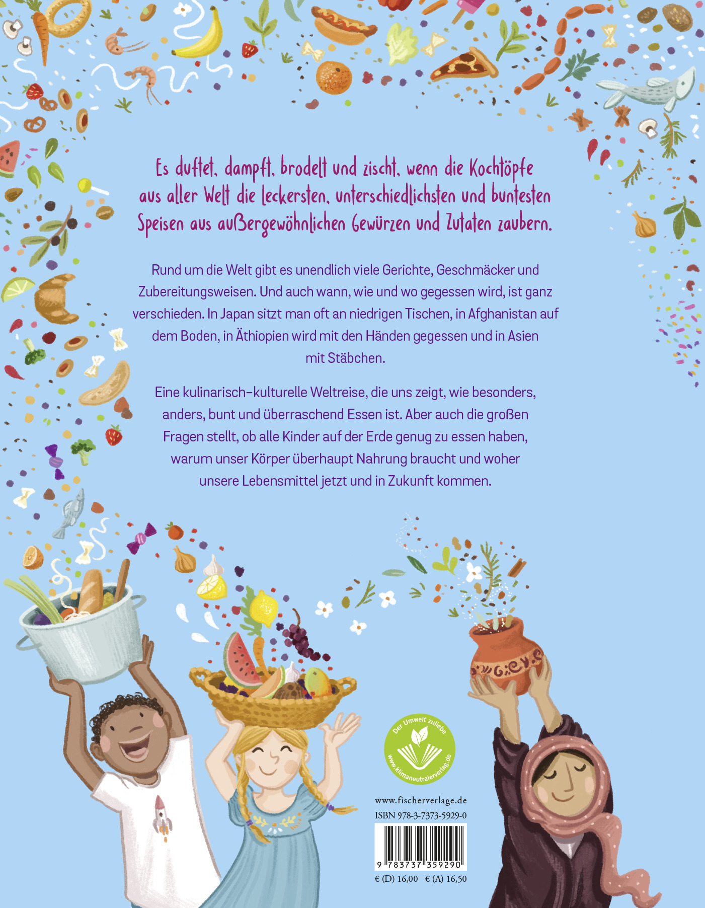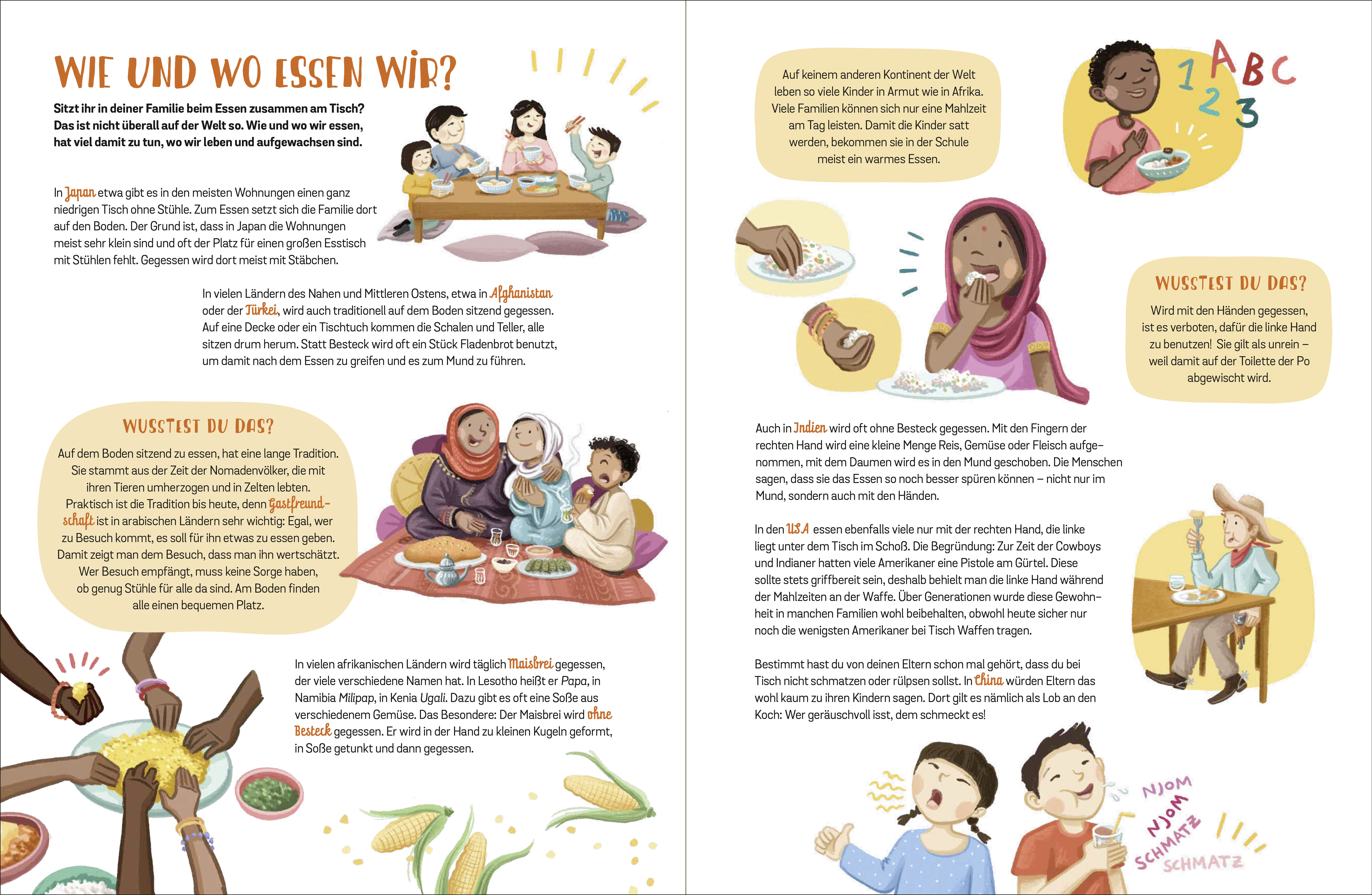 Es duftet, dampft, brodelt und zischt, wenn die Kochtöpfe aller Welt die leckersten, unterschiedlichsten und buntesten Speisen aus außergewöhnlichen Gewürzen und Zutaten zaubern. Jedoch gibt es nicht nur unendlich viele Gerichte und Zubereitungsweisen, auch wann, wie und wo gegessen wird, ist ganz verschieden. In Japan sitzt man oft an niedrigen Tischen, in Afghanistan auf dem Boden, in Äthiopien wird mit den Händen gegessen und in Asien mit Stäbchen.
