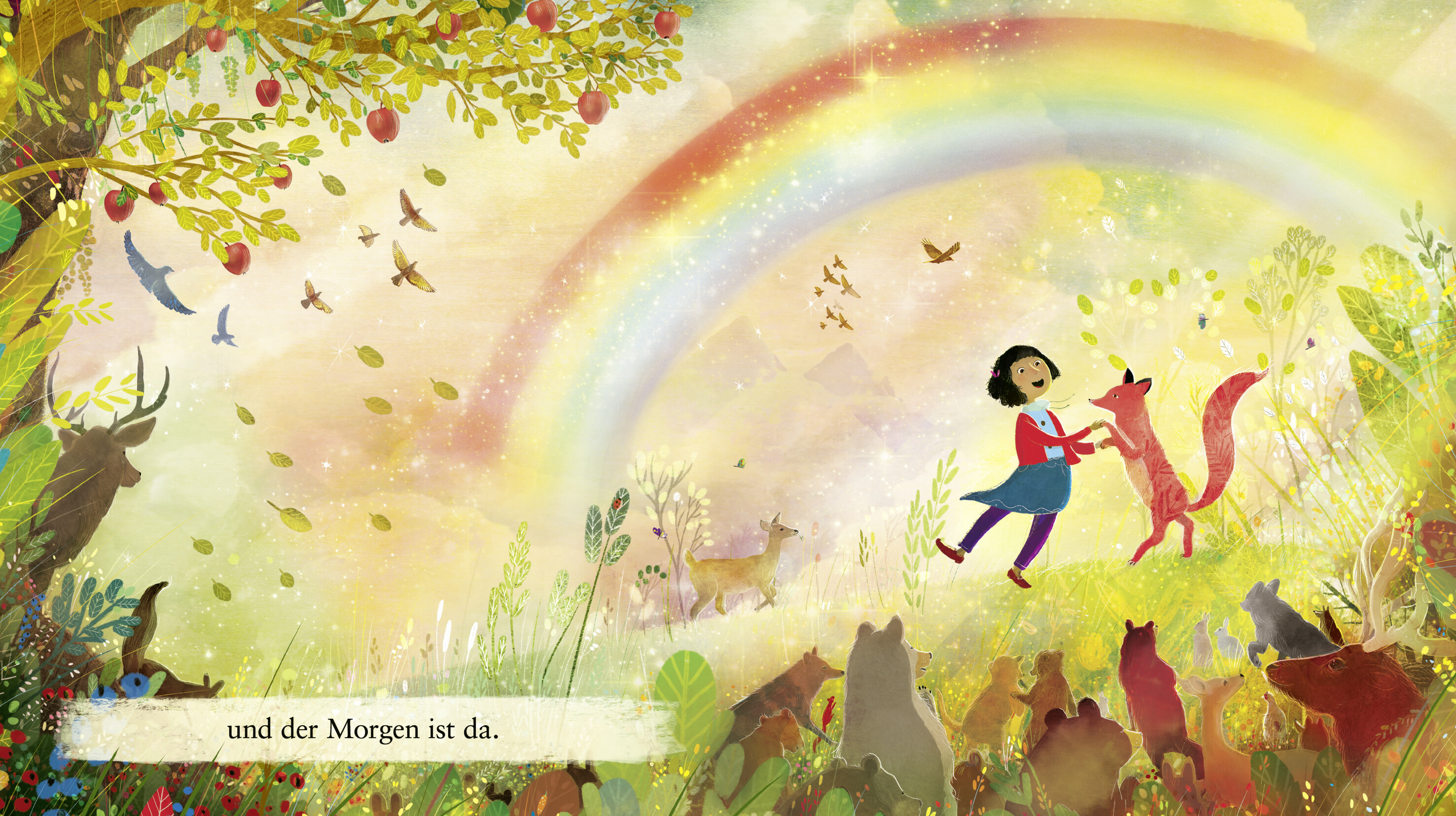 Manchmal sind die Tage voller Dunkelheit, da stehen einem scheinbar unüberwindbare Berge im Weg, wilde Stürme wehen einem entgegen. So geht es auch dem kleinen Mädchen und seinem Freund, dem Fuchs. Aber sie überwinden die Hürden gemeinsam, finden Freunde und am Ende ihres Weges ein großes Geschenk. Denn sie erfahren, dass auf Regen stets Sonnenschein folgt und der Regenbogen ein Versprechen ist. Denn auch nach dunklen Tagen wird es wieder hell.
