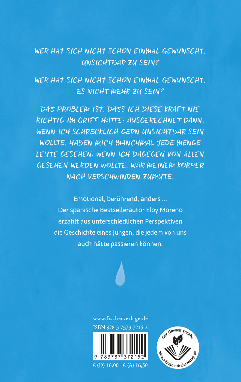Eloy Moreno, geboren 1976, arbeitete zunächst als Informatiker. Seine große Leidenschaft für Literatur veranlasste ihn, sich auf das Abenteuer Schreiben einzulassen. Seinen ersten Roman veröffentlichte er zunächst im Selbstverlag, ehe ein Verlag auf ihn aufmerksam wurde. Bisher hat er fünf Romane veröffentlicht, die allesamt zu Bestsellern wurden, mit renommierten Preisen ausgezeichnet und in zahlreiche Sprachen übersetzt wurden. »Unsichtbar« ist das erste Buch des Autors, das auf Deutsch erscheint.