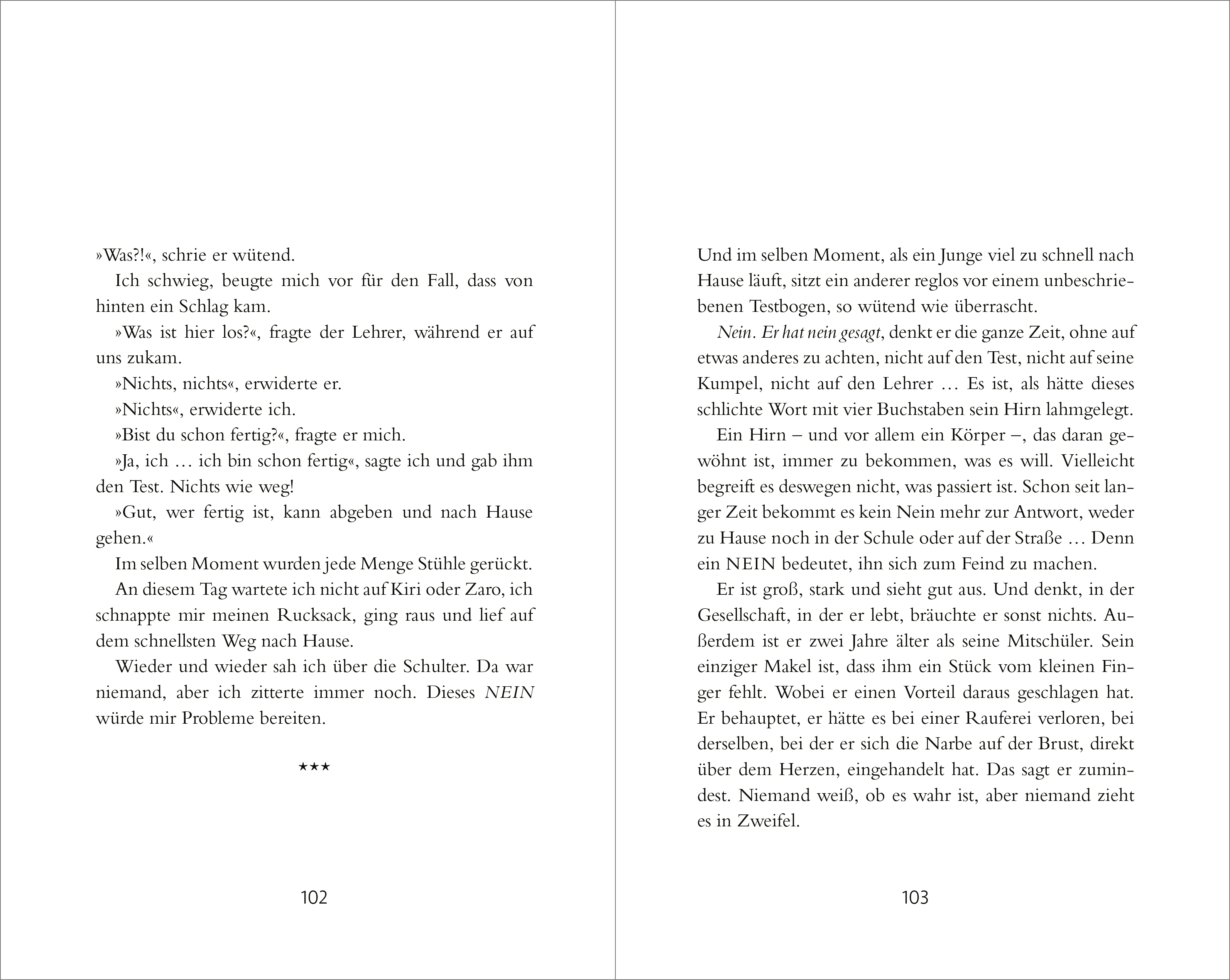 Der spanische Bestsellerautor Eloy Moreno erzählt leise, unaufgeregt, gleichzeitig verstörend und faszinierend die Leidensgeschichte eines namenlosen Jungen, der in der Schule gemobbt wird. Hautnah erleben wir die Angst, die Demütigungen und alle Phasen der Verzweiflung des Opfers, das keinen anderen Ausweg weiß, als in die Welt der Phantasie zu flüchten. Aber auch der Mobber und die, die wegsehen, kommen zu Wort.