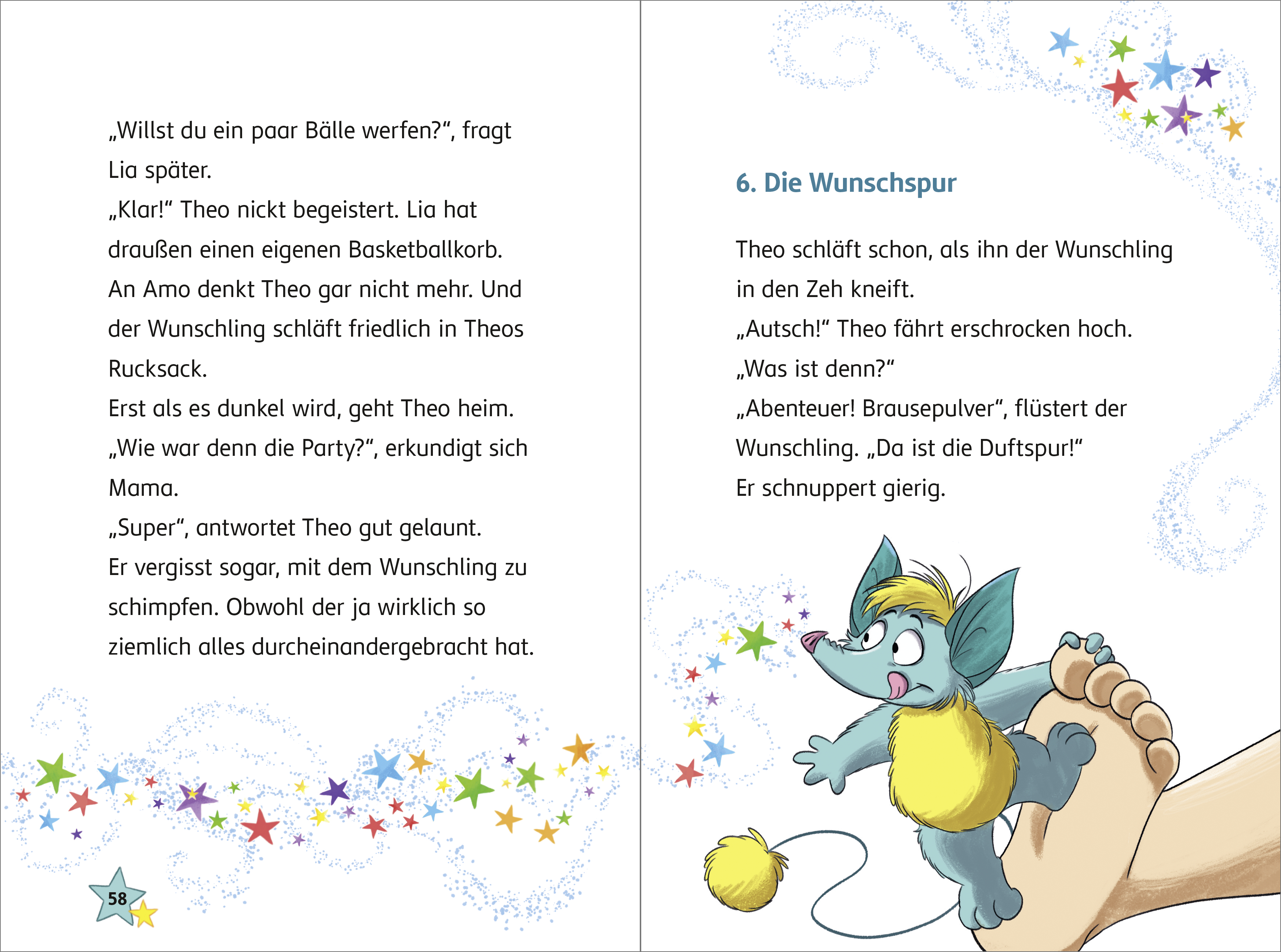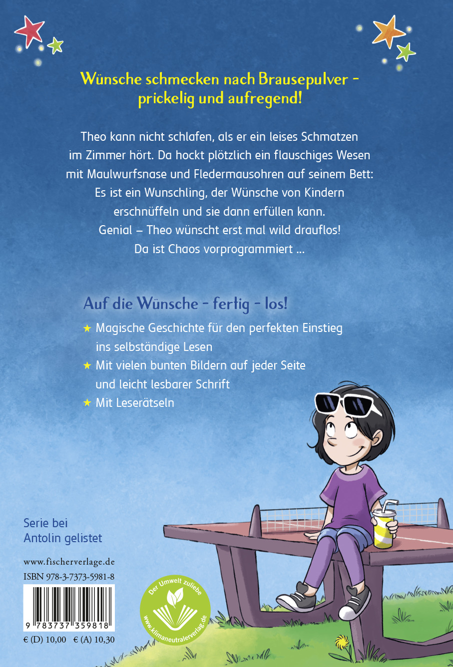 Theo hat Bammel vor seiner neuen Schule und kann nicht schlafen, als er ein leises Schmatzen, Gurgeln und Tapsen im Zimmer hört. Da hockt plötzlich ein kleines, flauschiges Wesen mit Maulwurfsnase und Fledermausohren vor ihm auf seinem Bett. Was ist das denn Bitteschön? Ein Troll? Frechheit! Es ist ein Wunschling, der Wünsche von Kindern erschnüffeln und sie dann erfüllen kann, wie cool! Das seltsame Kerlchen ist einer ganz besonders aufregenden und äußerst leckeren Duftspur gefolgt - so prickelig wie Abenteuer und Brausepulver. Aber der passende Leckerwunsch muss erst mal gefunden werden ... Von nun an weicht das freche Wesen Theo nicht mehr von der Seite, begleitet ihn in die Schule, ist manchmal eine ganz schöne Nervensäge und stellt sich bei der Wunscherfüllung ziemlich schusselig an. Am Ende hat Theo mit dem Wunschling aber nicht nur einen, sondern gleich mehrere neue Freunde gewonnen.