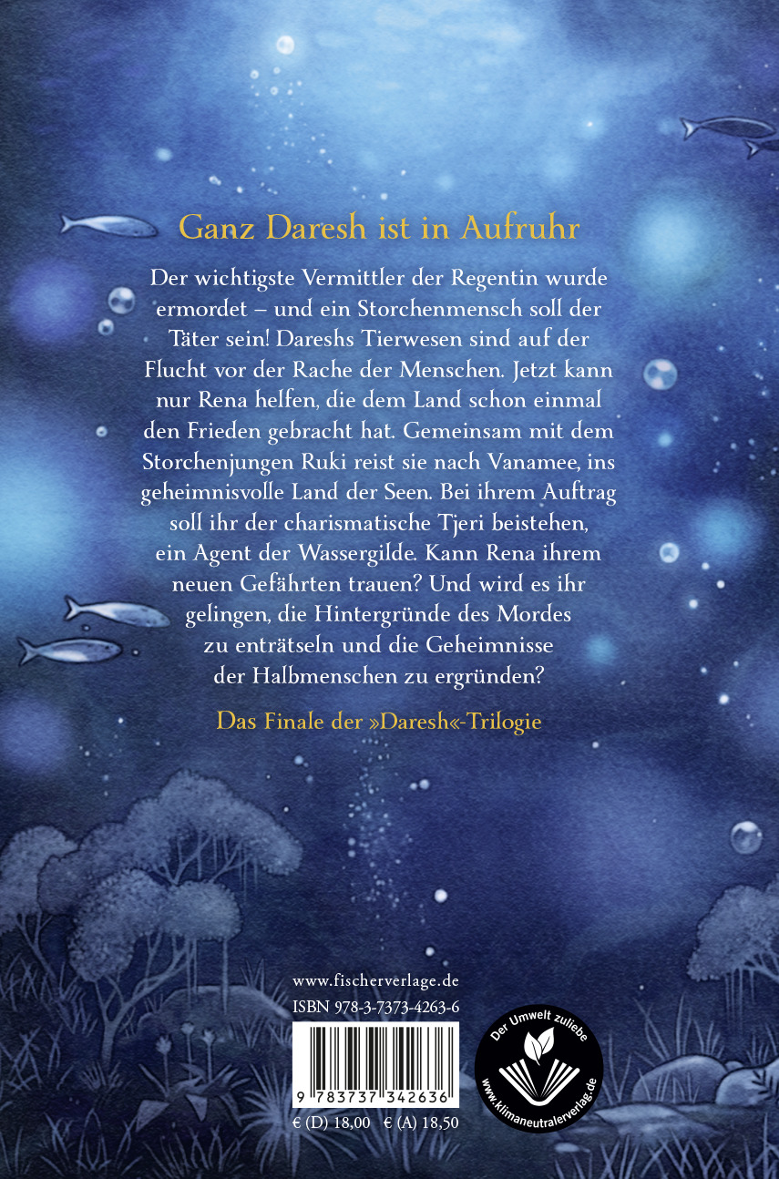 Ganz Daresh ist in Aufruhr: Der wichtigste Vermittler der Regentin, wurde ermordet - und ein Storchenmensch soll der Täter sein! Dareshs Tierwesen sind auf der Flucht vor der Rache der Menschen. Jetzt kann nur Rena helfen, die dem Land schon einmal den Frieden gebracht hat. Gemeinsam mit dem Storchenjungen Ruki reist sie nach Vanamee, ins geheimnisvolle Land der Seen. Bei ihrem Auftrag soll ihr der charismatische Tjeri helfen, ein Agent der Wassergilde. Kann Rena ihrem neuen Gefährten trauen? Und wird es ihr gelingen, die Hintergründe des Mordes zu enträtseln und die Geheimnisse der Halbmenschen zu ergründen?