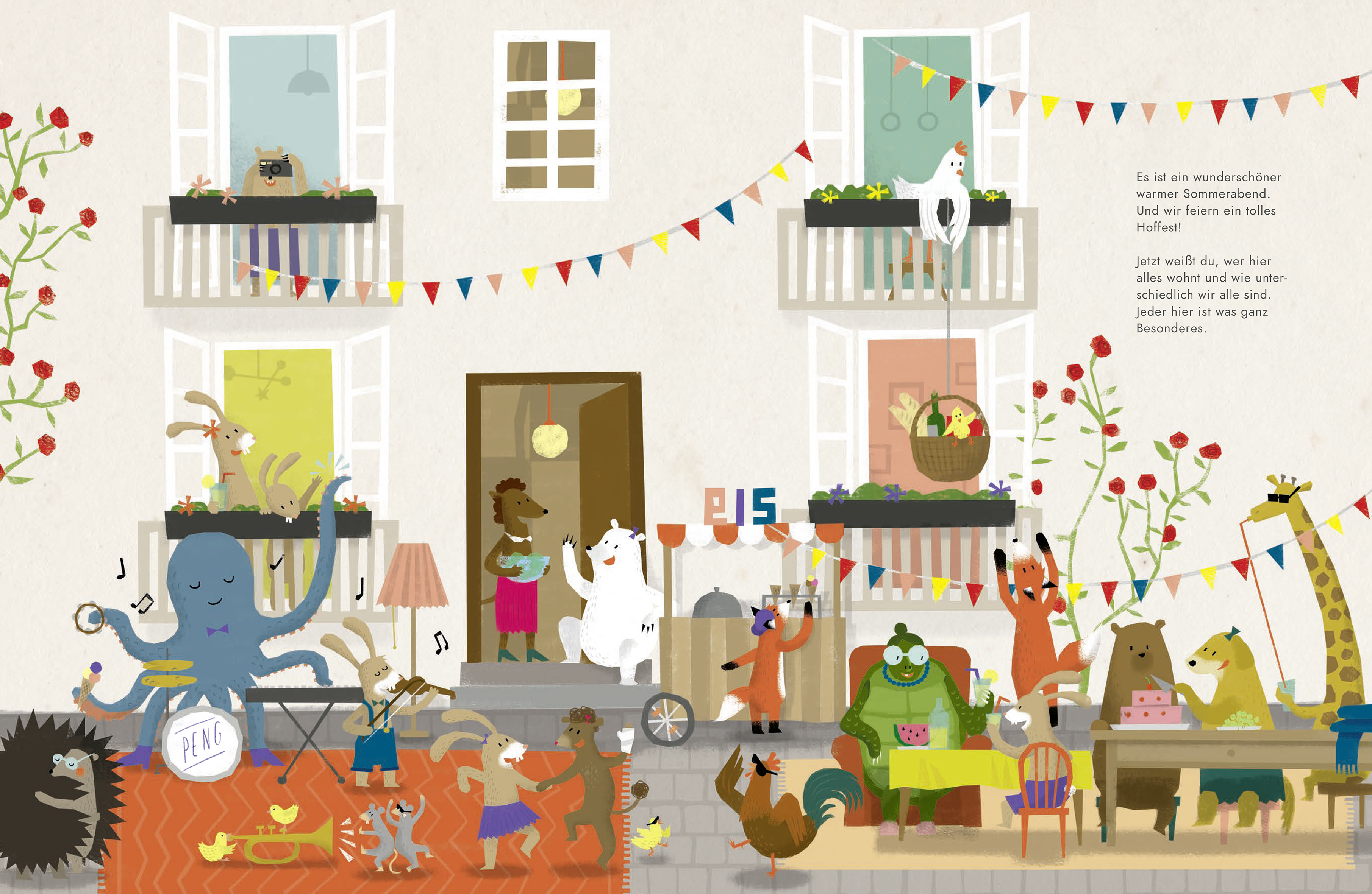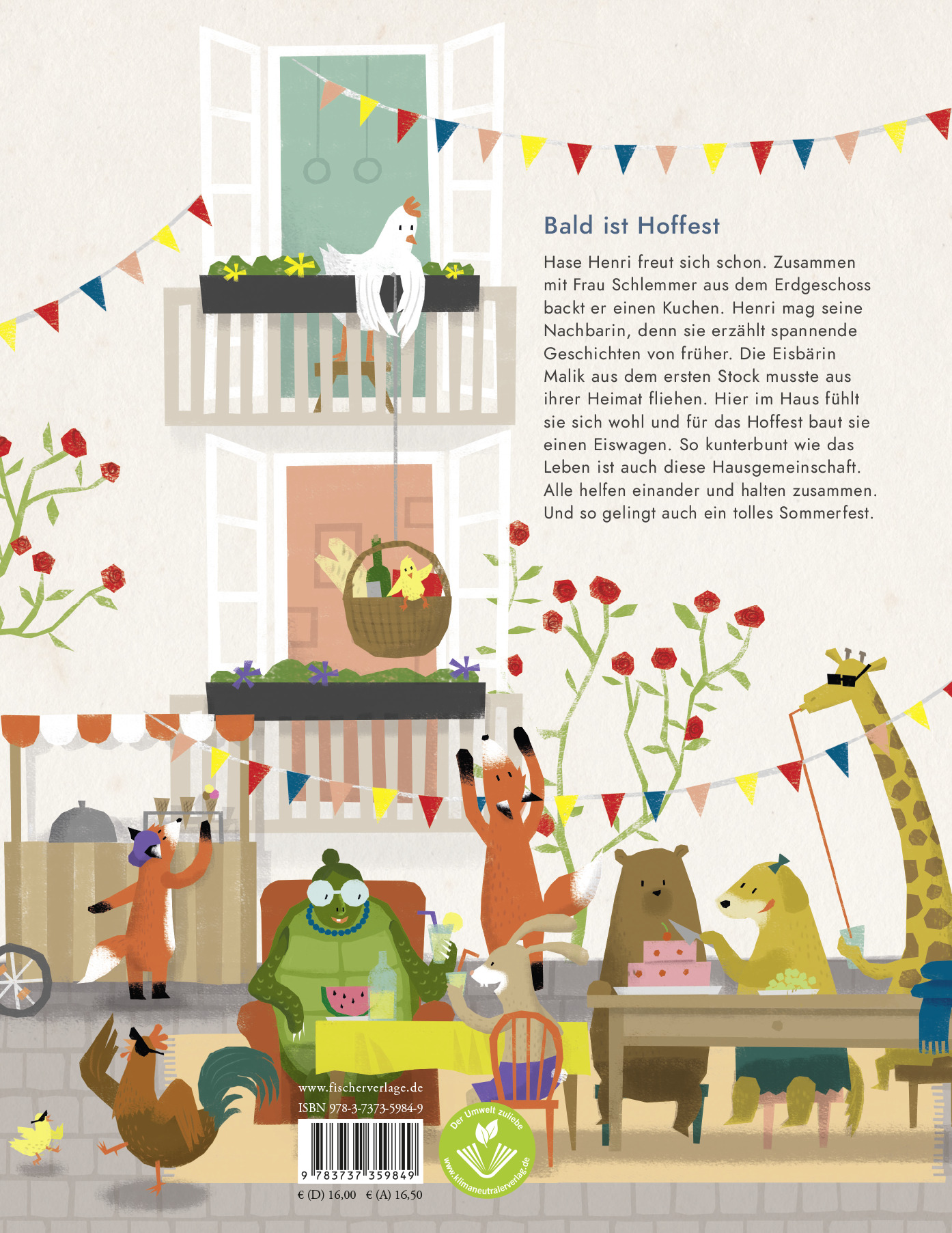 Bald ist Hoffest. Hase Henri freut sich schon. Zusammen mit Schildkröte Frau Schlemmer aus dem Erdgeschoss backt er einen Kuchen für das Fest. Er mag Frau Schlemmer, denn sie erzählt spannende Geschichten von früher. Die Eisbärin Malik aus dem ersten Stock, musste aus ihrer Heimat fliehen. Hier im Haus fühlt sich ihre Familie wohl und für das Hoffest baut sie einen Eiswagen. Hundemädchen Milla hat zwei Mamas. Sie bastelt eine bunte Girlande. Alle Bewohner in diesem kunterbunten Haus haben ihre eigene Geschichte. Aber sie halten alle zusammen und helfen einander. Denn nur so macht die Gemeinschaft in einem Haus Spaß und so gelingt auch ein tolles Sommerfest im Hof.