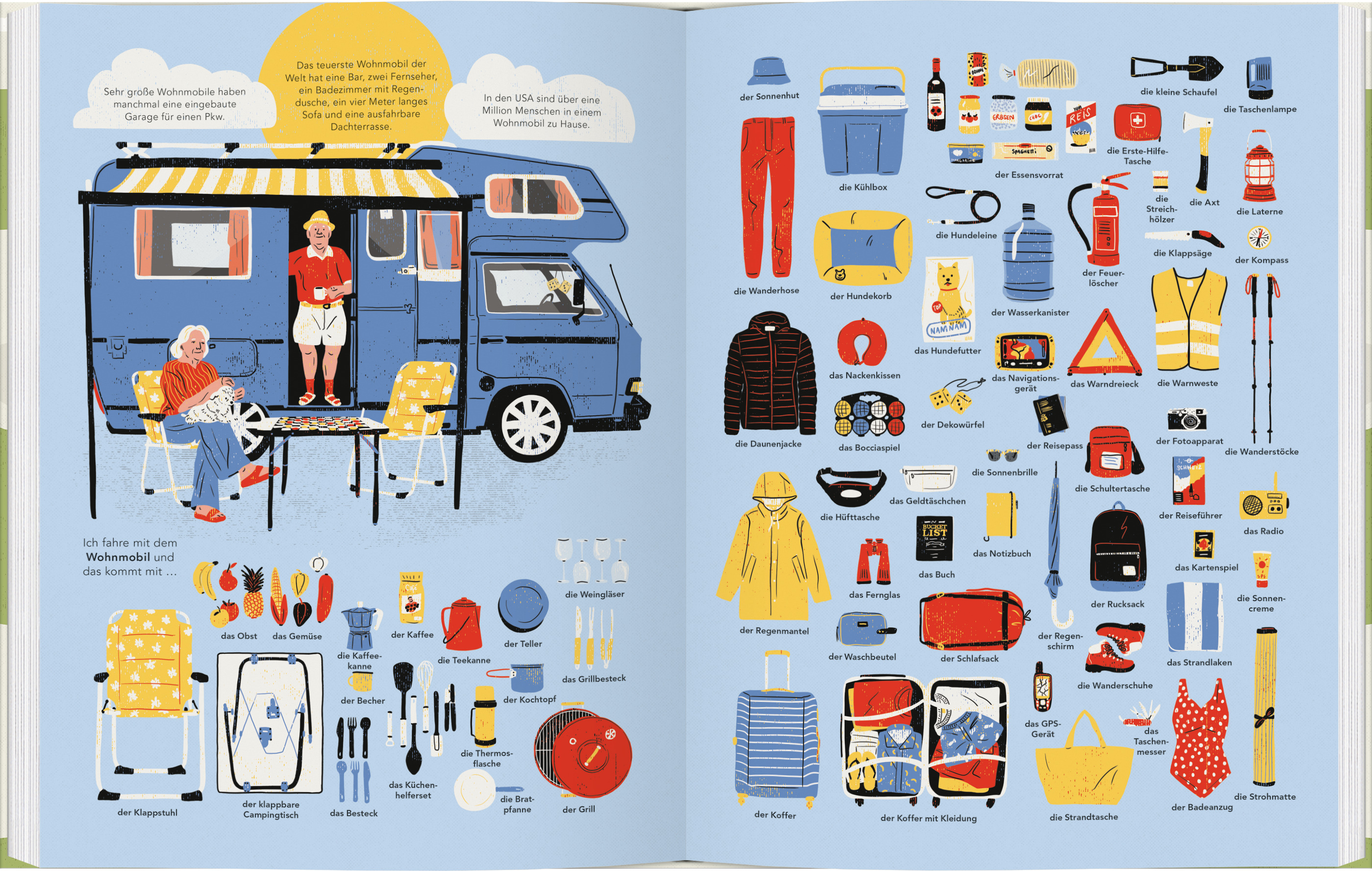 Was packt ein Förster in sein Forstauto? Welche Ausrüstung verbirgt sich in einem Feuerwehrauto und in einem Tourbus? Was nehmen Passagiere und Crew in dem großen Passagierflugzeug mit an Bord? Sieh nach, was alles in den elf verschiedenen Fahrzeugen verstaut ist, in die wir hier einen neugierigen Blick werfen dürfen. Tausend überraschende Dinge lassen sich im Gepäck finden! Und was packt deine Familie ein, wenn sie mit dem Auto auf Reisen geht? Dieses fröhlich gestaltete Wimmelsachbuch in modernem Retrodesign lädt ein, immer wieder Neues zu entdecken! Forstauto - Feuerwehrauto - Wohnmobil - Tourbus - Paketauto - Rettungsboot - Polizeiauto - Foodtruck - Rettungswagen - Familienauto - Flugzeug
