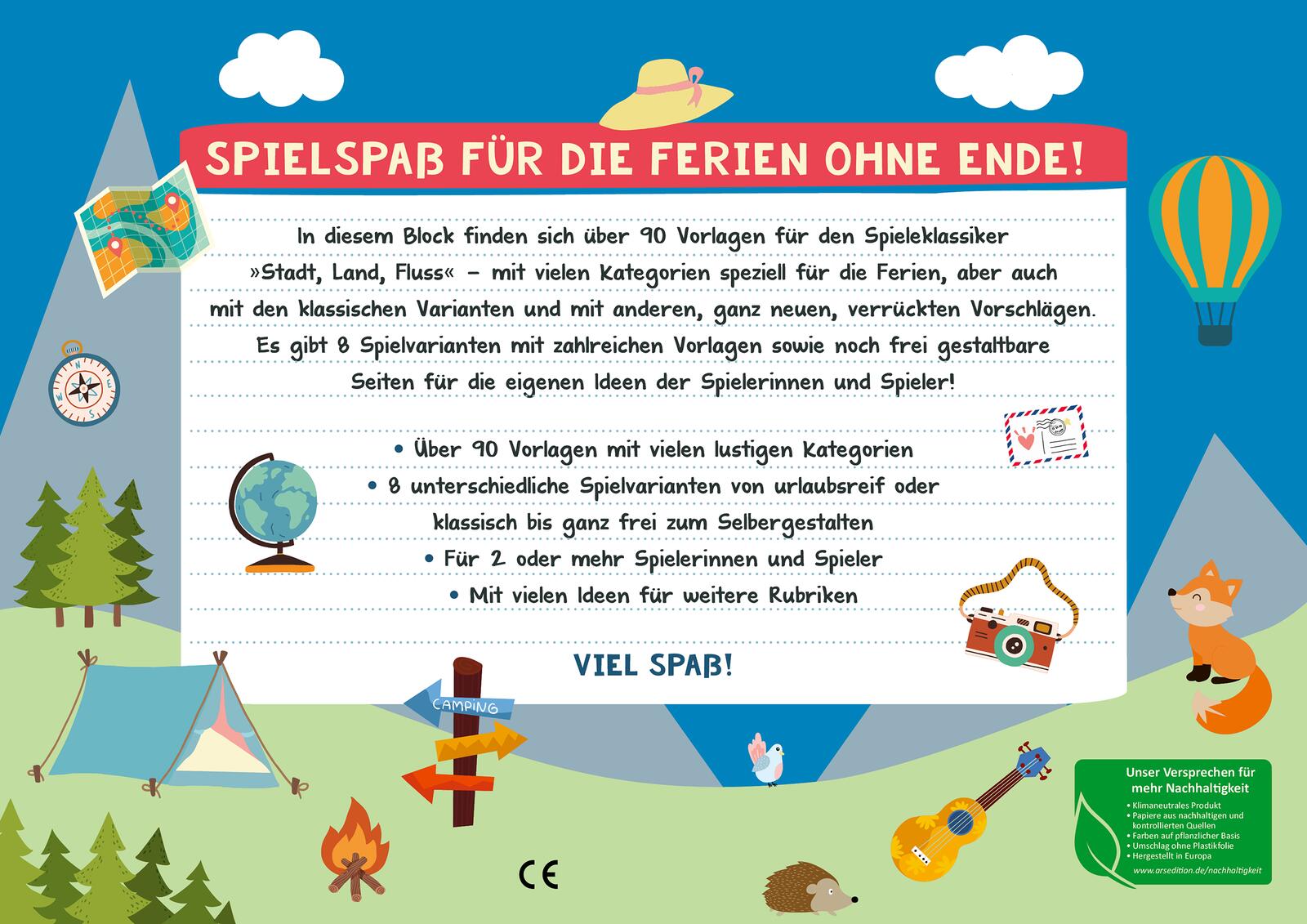 In diesem Ferienblock finden sich über 90 Vorlagen für den Spieleklassiker "Stadt, Land, Fluss" - sowohl mit den klassischen Kategorien also auch mit ganz neuen, verrückten Rubriken! Es gibt 8 Spielvarianten mit zahlreichen Vorlagen, davon 2 speziell für die Ferien- und Urlaubszeit, sowie noch viele frei gestaltbare Seiten für die eigenen Ideen der Spieler und Spielerinnen.