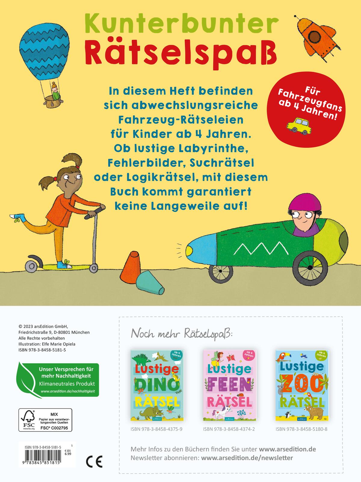 In diesem Heft befinden sich abwechslungsreiche Fahrzeug-Rätseleien für Kinder ab 4 Jahren. Ob spannende Labyrinthe, Fehlerbilder, Suchrätsel oder Logikrätsel, mit diesem Buch kommt garantiert keine Langeweile auf!
