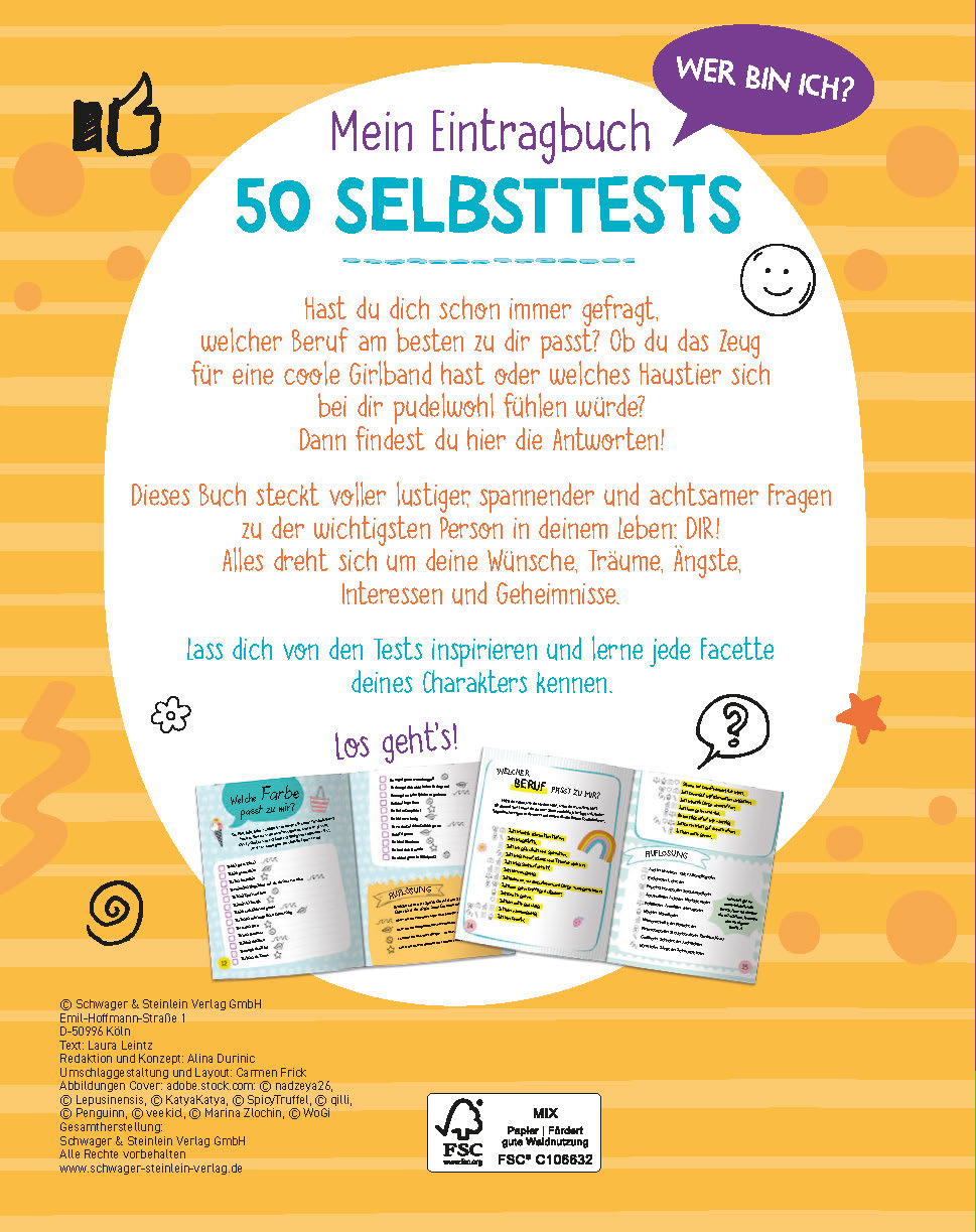 | Schlagworte | Beschäftigungsbuch Mädchen • Buch für Mädchen • Buch gegen Langeweile • Buch Mädchen ab 8 Jahre • Buch mit Persönlichkeitstest • Buch über Gefühle • buch zum ausfüllen • einfache Beschäftigung für Mädchen • Eintragbuch für Kinder • Fragenbuch • Freundebuch • Freundschaftsbuch • für Schulkind • geburtstagsgeschenk kind • Geschenk für Grundschulkind • _Geschenk für Mädchen • Geschenk für Mädchen • Geschenkidee Mädchen • geschenk unter 10 euro • günstiges Geschenk Kind • Ideenbuch • Kinderbeschäftigung • Kreatives Kinderbuch • Mädchenbuch zum Eintragen • mitmachbuch mädchen • Partyspiele • persönlichkeitstest für kinder • Psychotest • Psychotests für Kinder • Schwager & Steinlein Verlag • sich selbst besser kennenlernen • SST • Zur Kommunion |
