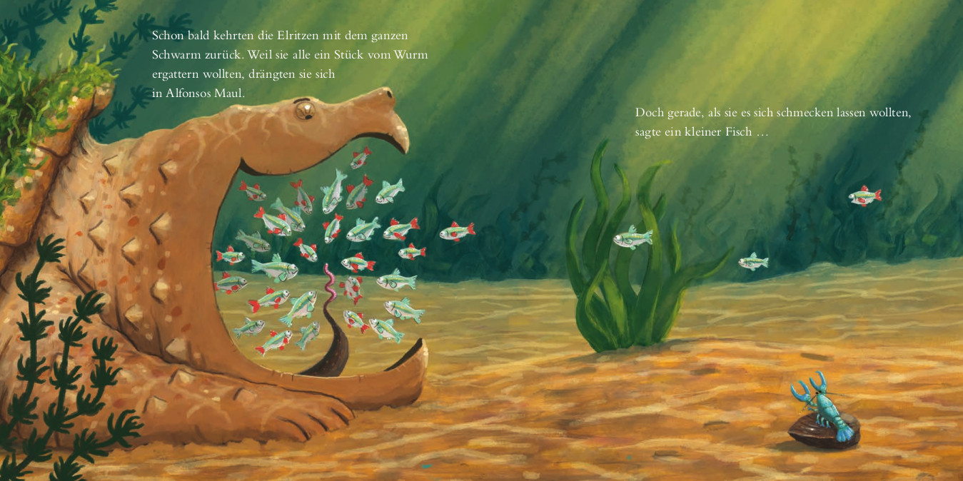 Auf dem Grund eines Teiches wartet Alfonso geduldig darauf, dass ihm das Frühstück ins Maul schwimmt. Seine Ringelzunge sieht aus wie ein Wurm und lockt Beutefische perfekt an. Alfonso ist eine Geierschildkröte. Doch diesmal kommt es anders: Ein Elritzenschwarm will der dicken Oma Bertha mit dem Wurm eine Geburtstagsfreude bereiten. Das lässt Alfonso frohlocken. Dann aber geschieht etwas, was sein Herz erweicht und ihn von seinem Frühstücksplan abhält - er wird zum Helden! Ein wunderbar unterhaltsames Bilderbuch, das verblüfft und beweist, dass John Hare neben textlosen Bilderbüchern auch die Klaviatur »normaler« Bilderbücher zu spielen versteht.