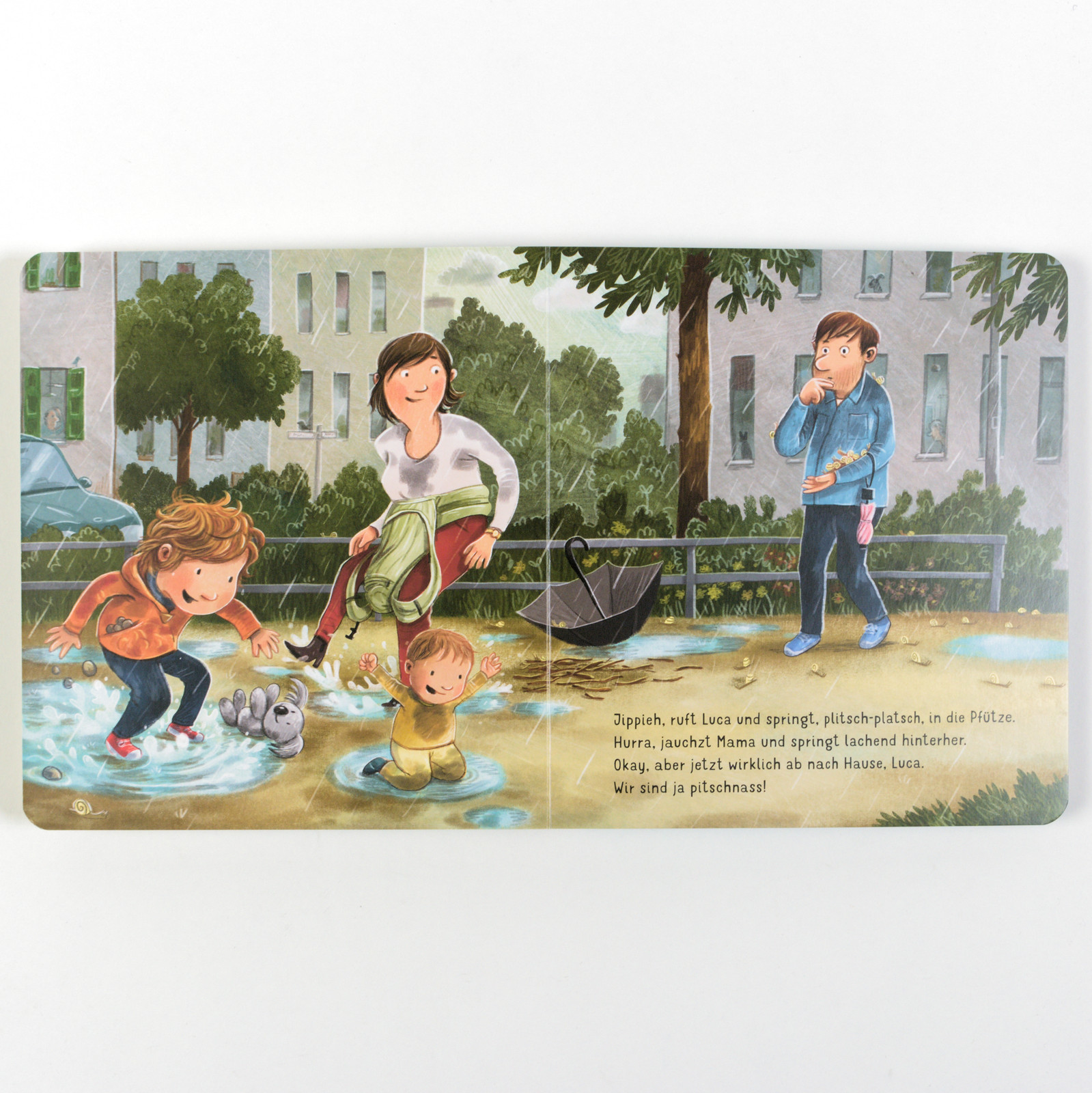 Ein schöner Nachmittag auf dem Spielplatz, doch als es zu regnen beginnt, ruft Papa: »Los, lass uns nach Hause gehen, Luca!« So schnell geht das aber nicht, wie Lucas Eltern sich das denken. Nur noch fünfmal schaukeln! Natürlich gibt es auch noch tausendundein Ding zu entdecken (Blumenblüten), aufzuheben (Kieselsteine), zu retten (schleimige Schnecken), hineinzuspringen (matschige Pfützen). Mama und Papa werden von Lucas Begeisterung angesteckt und sie erleben einen aufregenden Heimweg voller kleiner Abenteuer.Blicköffnend und bedürfnisorientiert erzählen die Wunschkind-Erfolgsautorinnen, wie wichtig es für alle ist, Kindern Zeit zu geben, ihr eigenes Tempo zu finden.