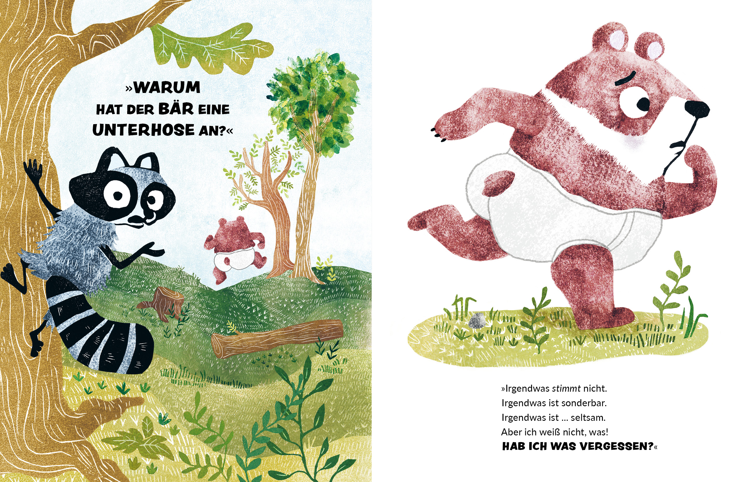 Jeff, der Bär, hat das Gefühl, dass heute irgendetwas komisch ist. Bloß was? Auch alle anderen Tiere sehen ihn so komisch an. Was stimmt denn nur nicht? Zum Glück ist sein bester Freund Anders zur Stelle: Jeff hat tatsächlich etwas vergessen. Er trägt noch seine Unterhose über dem Fell! O nein, wie peinlich, sein guter Ruf ist dahin. Zum Glück übersteht man mit einem besten Freund selbst Unterhosen-Tage. Und so wird im Wald von Jeff und Anders ein neuer Modetrend geboren: Unterhosen über dem Fell zu tragen ist plötzlich hip! Auf gute Freunde kann man sich eben immer verlassen, ein bisschen so wie auf eine Lieblingsunterhose ...