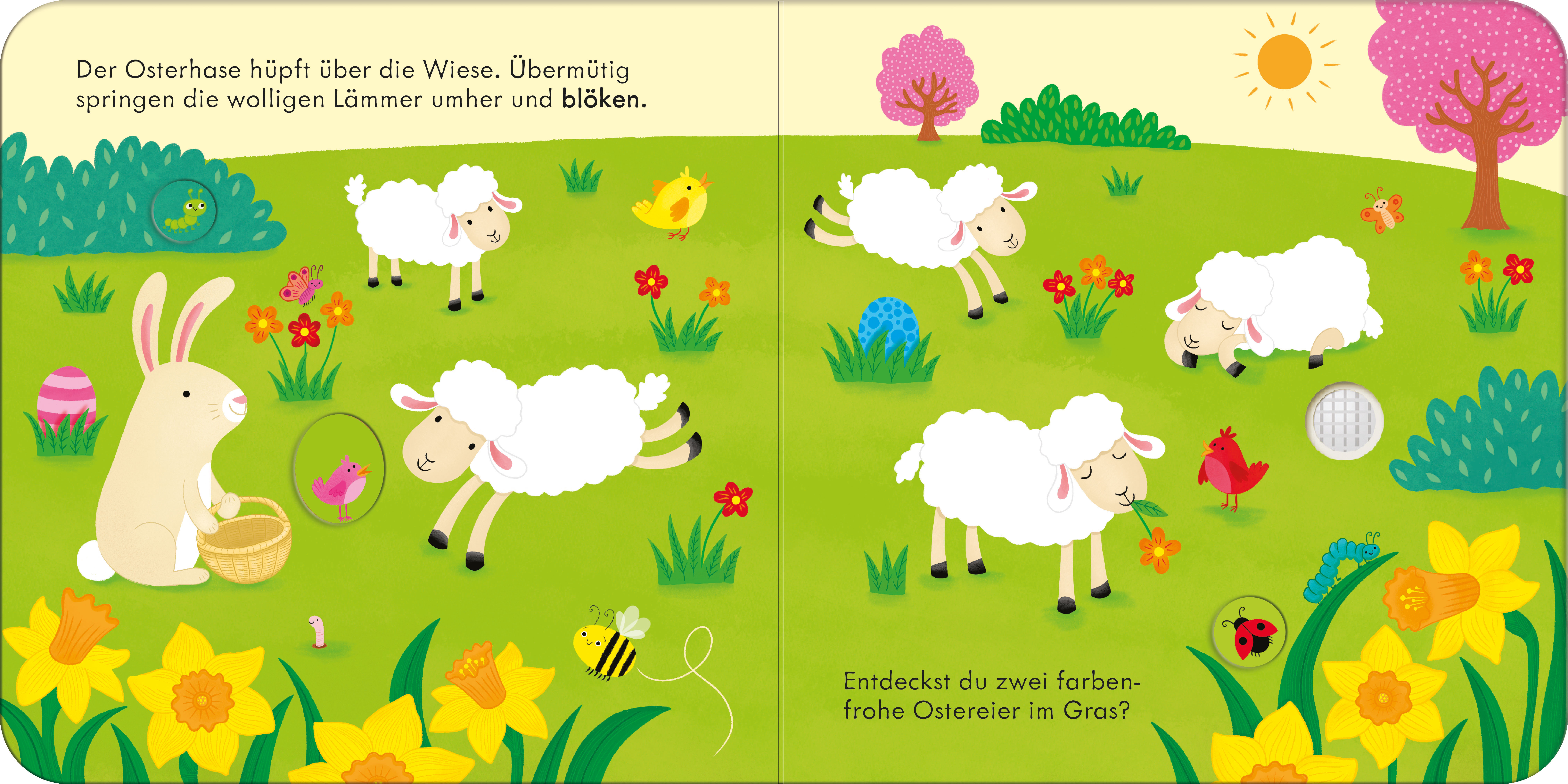 Die Vögel zwitschern, die Lämmer blöken, die Küken piepsen - und der Osterhase versteckt bunte Eier für sie alle! Durch leichte Berührung der Soundchips ist das Einschalten der fünf Geräusche auch für die Kleinsten ein Kinderspiel.