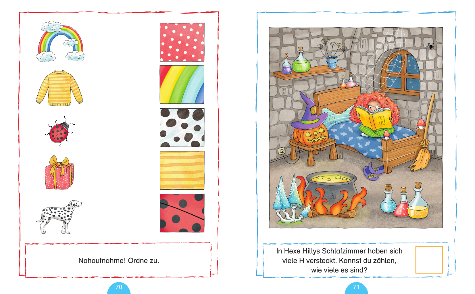 - Mit vielen bunten Aufgaben, die im kindlichen Umfeld oder in einer bunten Tierwelt spielen.