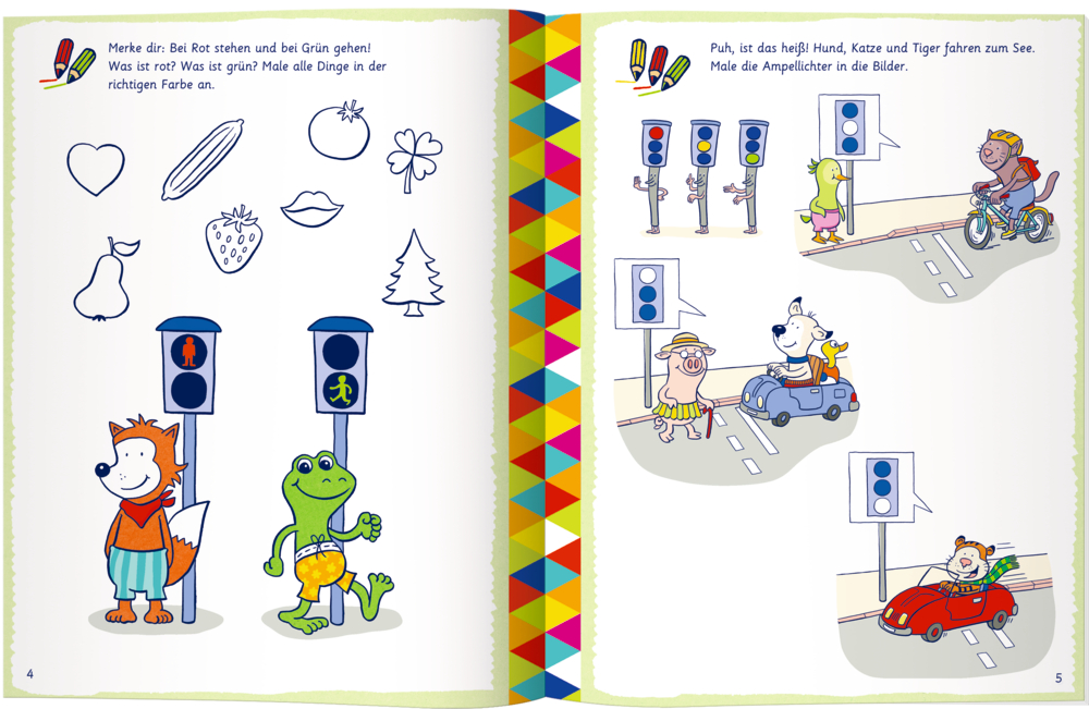 Die abwechslungsreichen Übungen in diesem Heft führen Ihr Kind spielerisch an die Regeln im Straßenverkehr heran. Wer darf den Gehweg benutzen? Wie verhält man sich an der Ampel? Und sitzt der Fahrradhelm richtig? Ob Straßen-Labyrinth, Schilder ausmalen oder Fehler entdecken - Ihr Kind wird motiviert, eine Aufgabe fertigzustellen, und lernt, wie es sich im Straßenverkehr verhalten soll. Das ist die beste Basis für einen sicheren Schulweg!