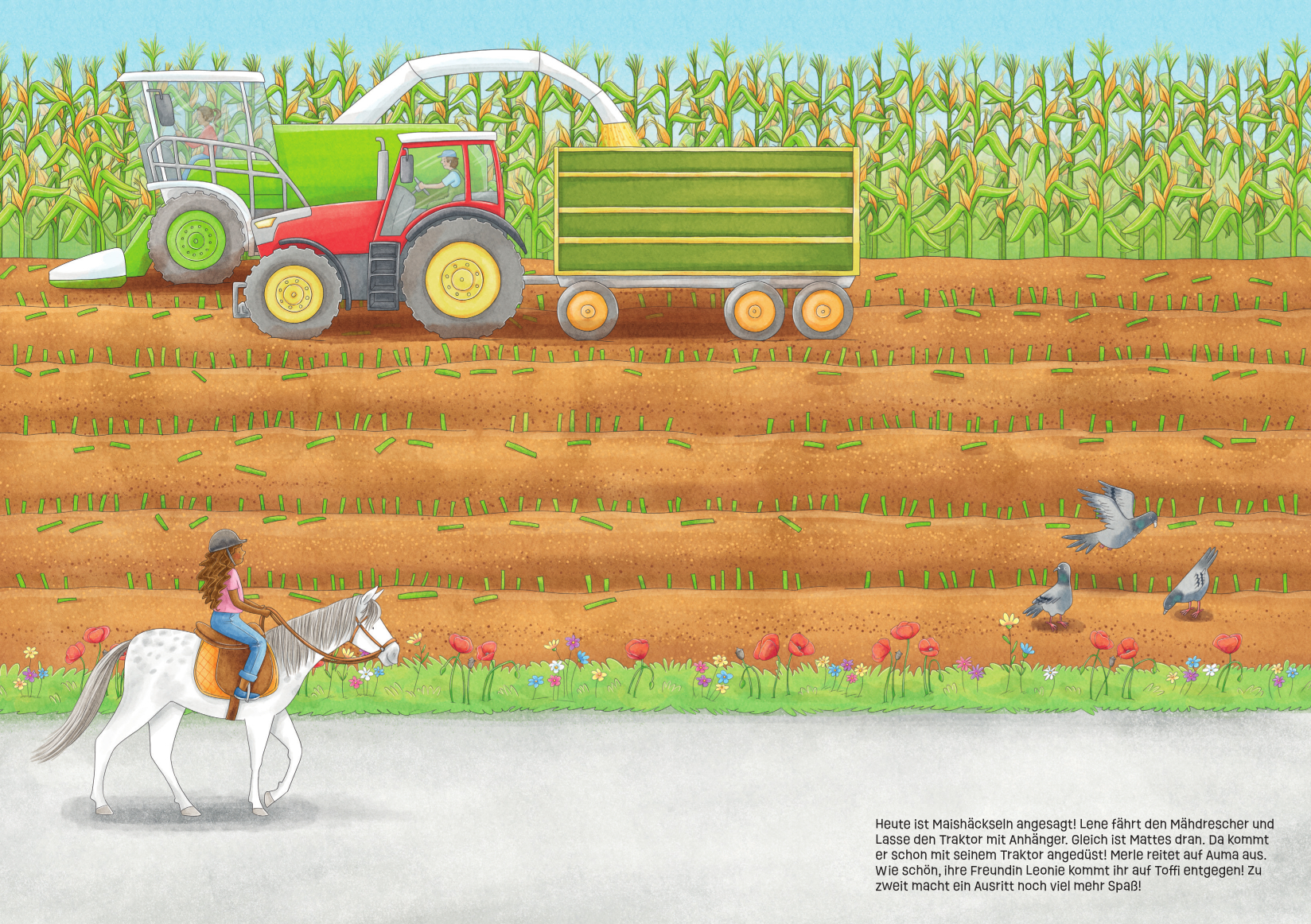 Die Ziegen genießen das frische Gras, aber die kleine Ziege Zora balanciert lieber auf Papas Rücken. Malte mopst sich eine Birne vom Baum und beißt genüsslich hinein, während seine Hunde Bonni und Bruno Tauziehen spielen.
