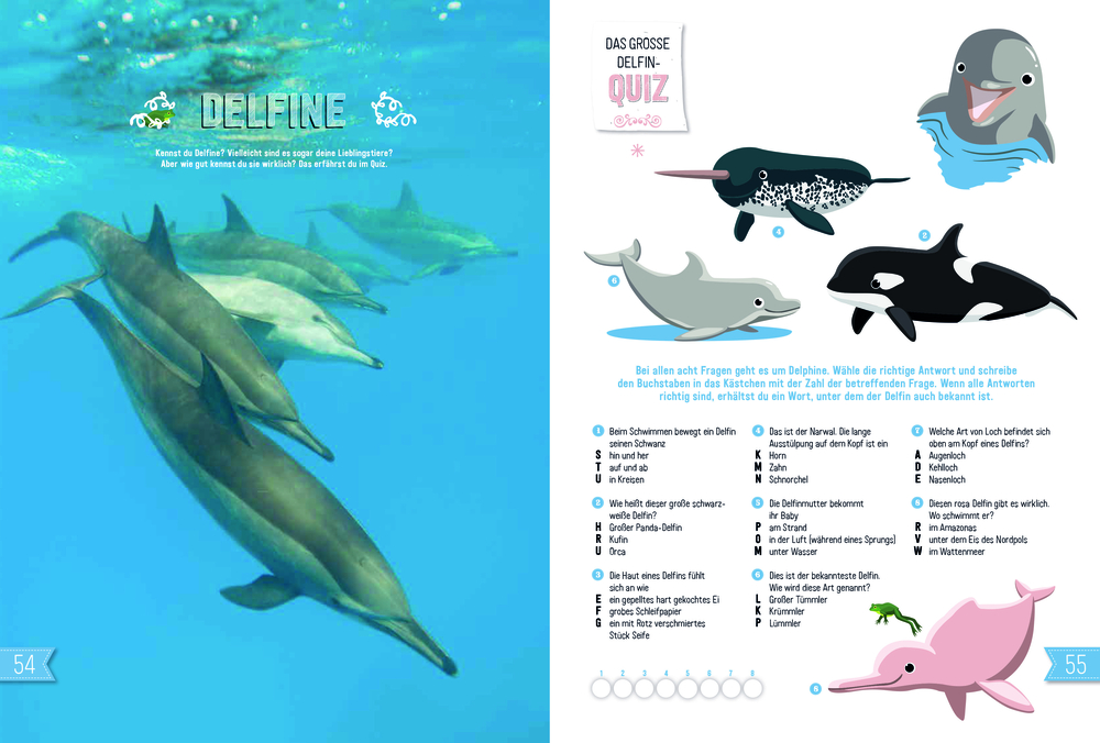 Aber es gibt in der wunderbaren Welt unter Wasser noch viel mehr zu entdecken. Sowohl im Süßwasser als auch im Salzwasser. Weißt du zum Beispiel, wie viele Arten von Haien es im Meer gibt? Oder dass Papa Seepferdchen die Eier in einem Beutel auf seinem Bauch ausbrütet? Dass eine Krabbe zwei verschiedene Scheren hat: eine stumpfe und eine scharfe. Und dass es Fische mit Namen wie Seehase, Kofferfisch und Feuerfisch gibt? Beim Ausmalen, Rätsellösen und Entdecken in diesem Unterwasser-Buch erfährst du die Antworten. Du wirst erstaunt sein, was man alles lernen kann, egal wie alt oder wie jung: Es gibt immer Neues zu Endecken. Viel Spaß beim Mitmachen!