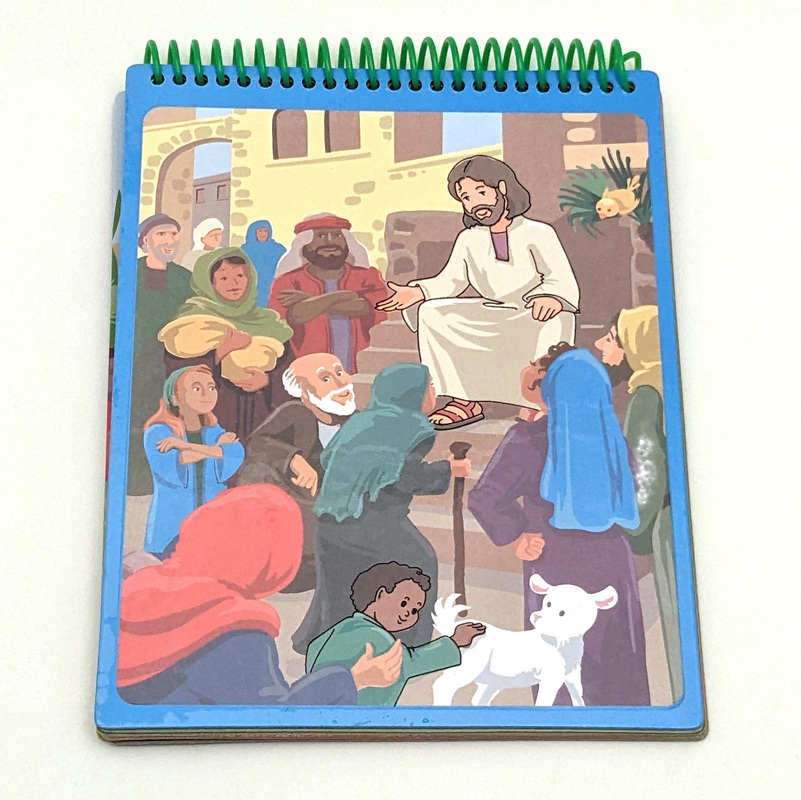 Jesus erzählt vom verlorenen Schaf und dem guten Hirten. Befeuchtet man die weißen Flächen, werden die farbigen Bilder sichtbar. Trocknen die Seiten, verschwindet die Farbe, und man kann von vorne beginnen. Der beiliegende Pinsel lässt sich dazu immer wieder neu mit Leitungswasser auffüllen.