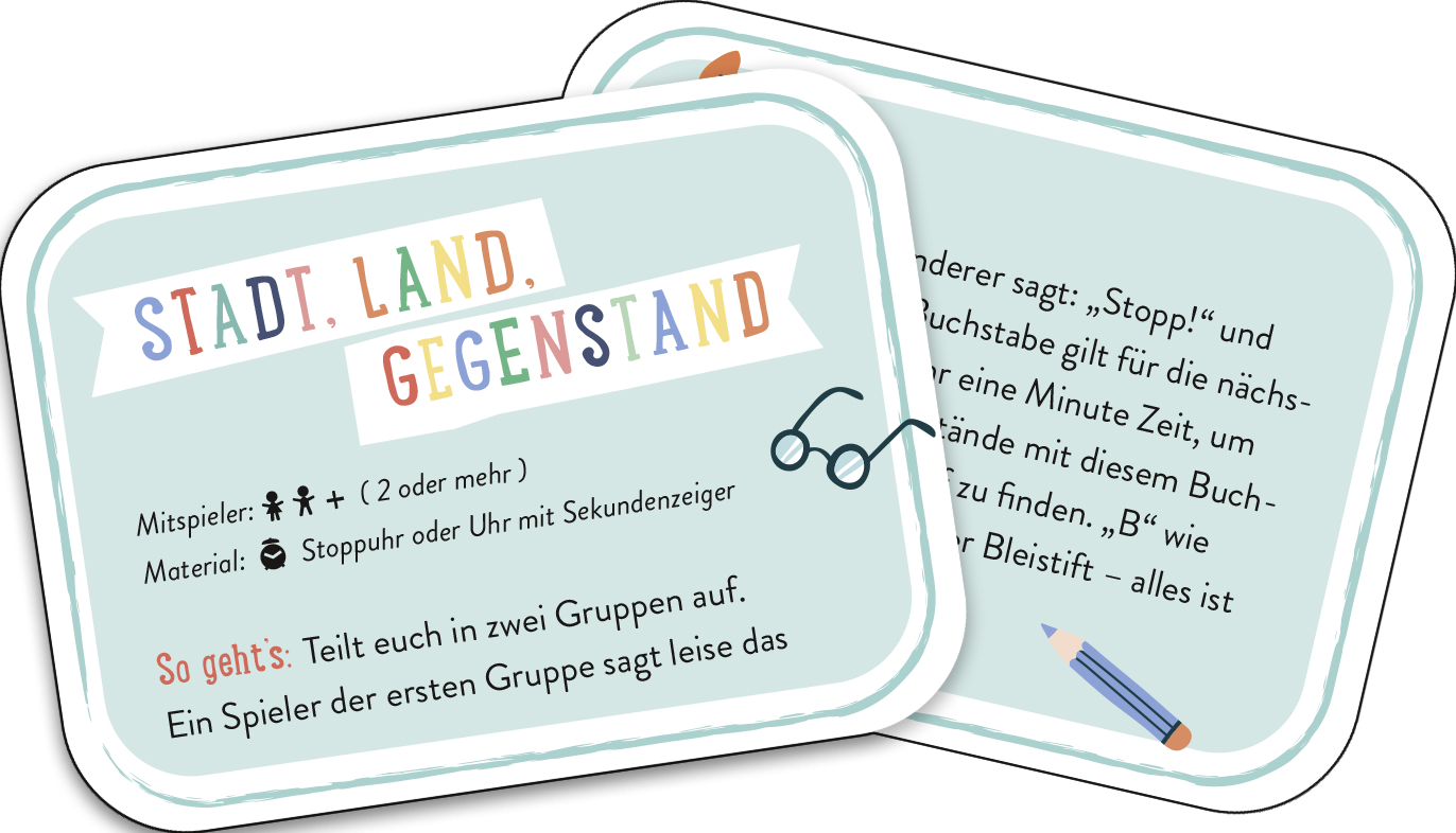 - Kartenbox Pausenspiele mit 25 Karten (Maße: 8,4 x 6,5 cm)