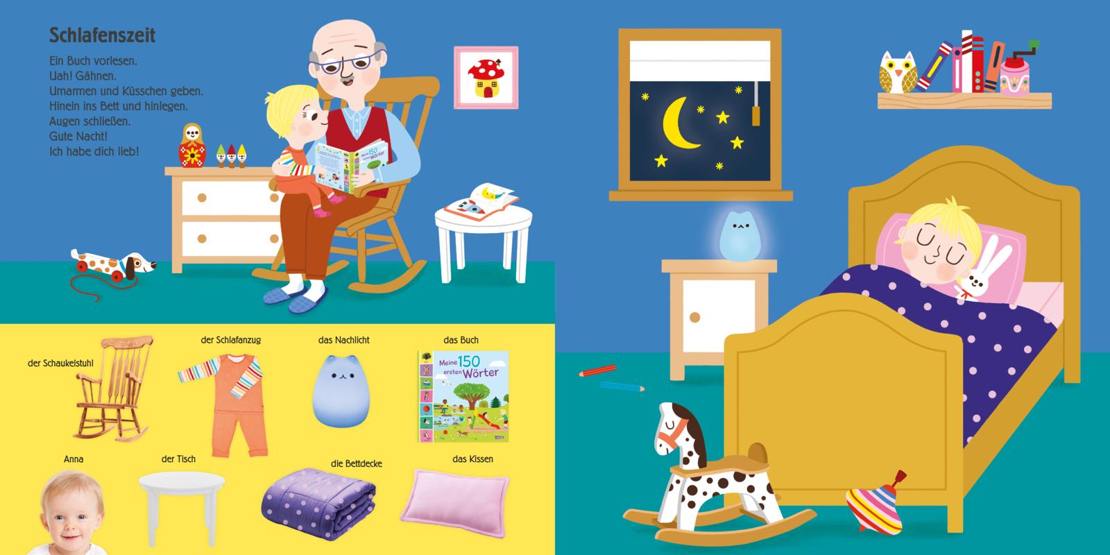- Spielerischer Spracherwerb durch erste Wörter und große, altersgerecht gestaltete Szenen aus dem Kinderalltag.