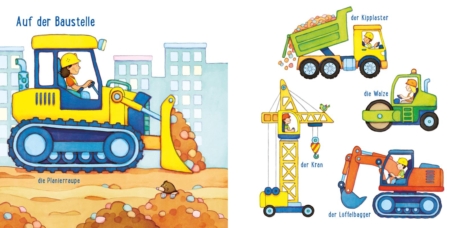 Welche Fahrzeuge kennst du schon - den Löffelbagger, den Mähdrescher oder das Feuerwehrauto? Und welches magst du am liebsten? Ein erstes buntes Bildwörterbuch für kleine Fahrzeug-Fans - als unkaputtbares Buggybuch zum Mitnehmen.