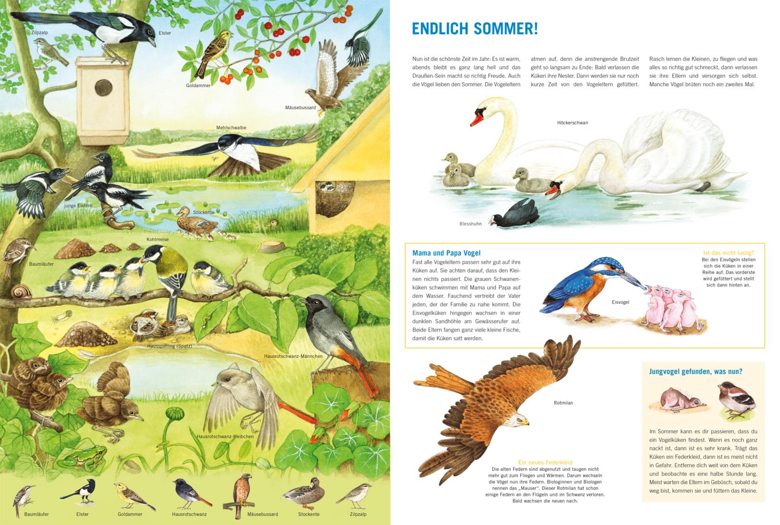 Wie sieht ein Amsel-Ei aus? Warum haben Vögel Federn? Und welche Gartenvögel können wir im Winter antreffen? Hier lernen Kindergartenkinder über 50 heimische Vogelarten kennen und begleiten sie durch die vier Jahreszeiten. Sie sind mit dabei, wenn Blaumeisen und Rotkehlchen im Frühjahr ihre Nester bauen und im Sommer ihre Jungen bei den ersten Flugrunden beobachten. Oder im Herbst, wenn Weißstörche und andere Zugvögel gen Süden ziehen, während sich der Eichelhäher zu Hause eine dicke Fettschicht anfrisst. Ergänzt durch naturgetreue und detailreiche Illustrationen gibt es auf jeder Seite viel zu entdecken. Ideal, um in die spannende Welt der Vögel einzutauchen.
