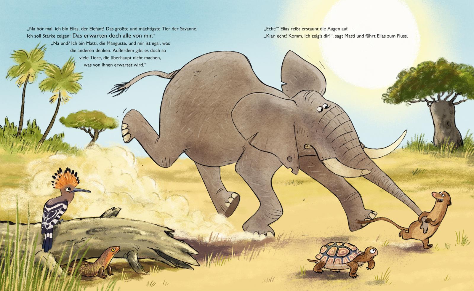 Es ist ein ganz gewöhnlicher Morgen in der Savanne - anscheinend zumindest. Matti, die kleine Manguste, wacht auf und möchte das Näschen ins Freie recken. Nur, das geht nicht! Vor dem Eingang seines Baues hockt ein riesengraues Dings mit faltigem, borstigem Popo und versperrt Matti Weg und Sicht. Das ist Elias, der alte Elefant. Er ist sehr, sehr traurig - aber er hat verinnerlicht, dass Elefanten nicht weinen. Dabei würde er doch so gerne ... Also sitzt Elias da so rum, seufzt und weiß nicht weiter. Zum Glück ist Matti ziemlich nett und auch ganz schön schlau. Die Manguste weiß genau, dass es viel, viel besser ist, zu fühlen und zu tun, was wir wollen - und nicht, was wir angeblich sollen. Er führt Elias am Rüssel durch die Savanne und sie treffen: einen Löwen, der sich fürchtet, obwohl doch alle Tiere ihn fürchten, er selbst aber keine Angst haben soll. Ein Nilpferd, das tagsüber am Ufer grast, und eine Leopardin, die auf ein Affenbaby aufpasst, statt es zu jagen. Elias ist verblüfft und er versteht, dass er sehr wohl zu seinen Gefühlen stehen und weinen darf. Und das macht er dann auch. Aber nicht mehr vor Traurigkeit, sondern vor Rührung und Freude. Endlich hat er einen Freund gefunden, der ihm geholfen hat, zu sein, wie er will. Und außerdem bilden Matti und Elias am Ende eine Herde - auch wenn Mangusten und Elefanten das eigentlich nicht sollen ...