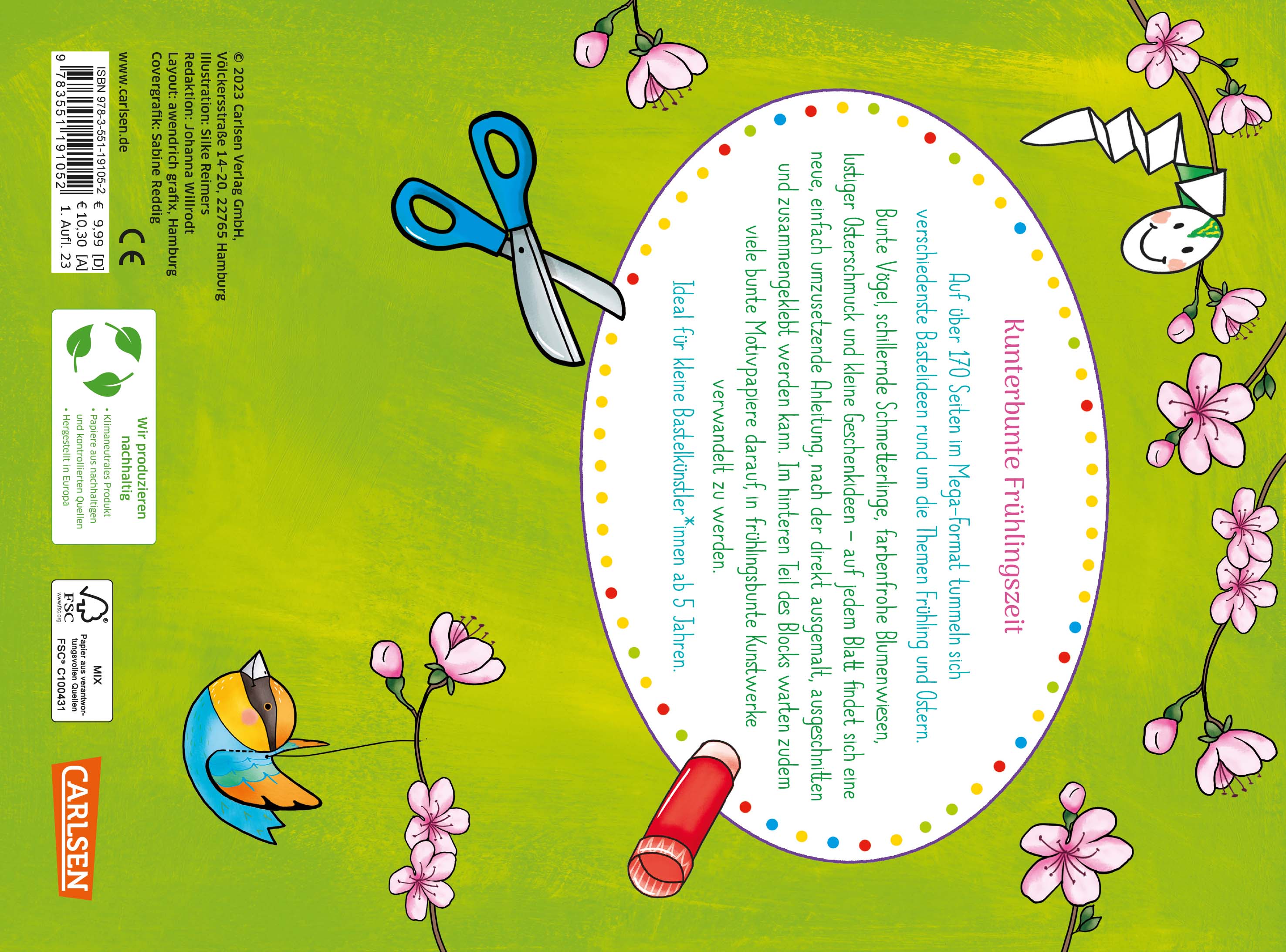 Bunte Vögel, schillernde Schmetterlinge, farbenfrohe Blumenwiesen, lustiger Osterschmuck und kleine Geschenkideen - auf jedem Blatt findet sich eine neue, einfach umzusetzende Anleitung, die direkt ausgemalt, ausgeschnitten und zusammengeklebt werden kann.