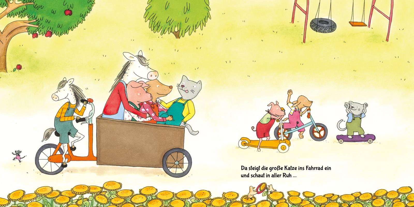 Familie Pferd hat ein tolles Gefährt! Ein Fahrrad mit großer Kiste! Damit lässt sich viel transportieren und wunderbar durch die Landschaft radeln. Und heute fährt das kleine Pferd das große Pferd. Los geht's! Wohin fahren die zwei? Und wer steigt unterwegs wohl noch mit ein?