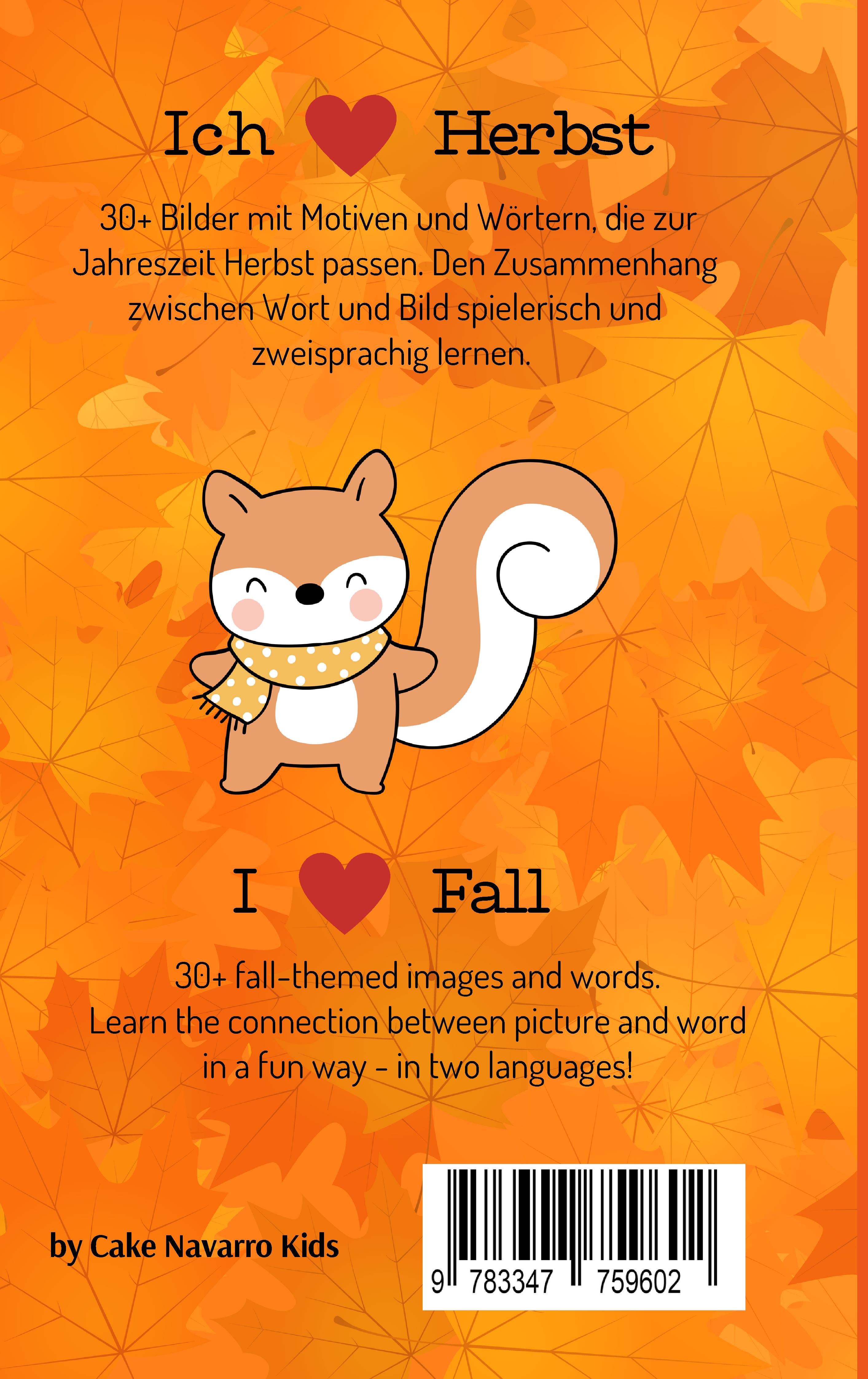 Erste englische und deutsche Wörter rund um die Herbstzeit spielerisch lernen. Für Babys und Kleinkinder ab 1 geeignet. Bunte, einfache Herbstmotiven mit einer zweisprachigen Bildbeschreibung auf Englisch und Deutsch . Wörter und einfache Beschreibungen (Wort Kombination) wie Farbe und Anzahl lernen. Süße Motive rund um Tiere, Wetter, Natur, Essen, Klamotten und Gemütlichkeit wie z.B. Kürbis, Katze, Regenschirm, Kuchen und mehr. Trainiert die Wiedererkennungsfähigkeit und fördert das Lernen von Farben, Zahlen und Zusammenhängen.