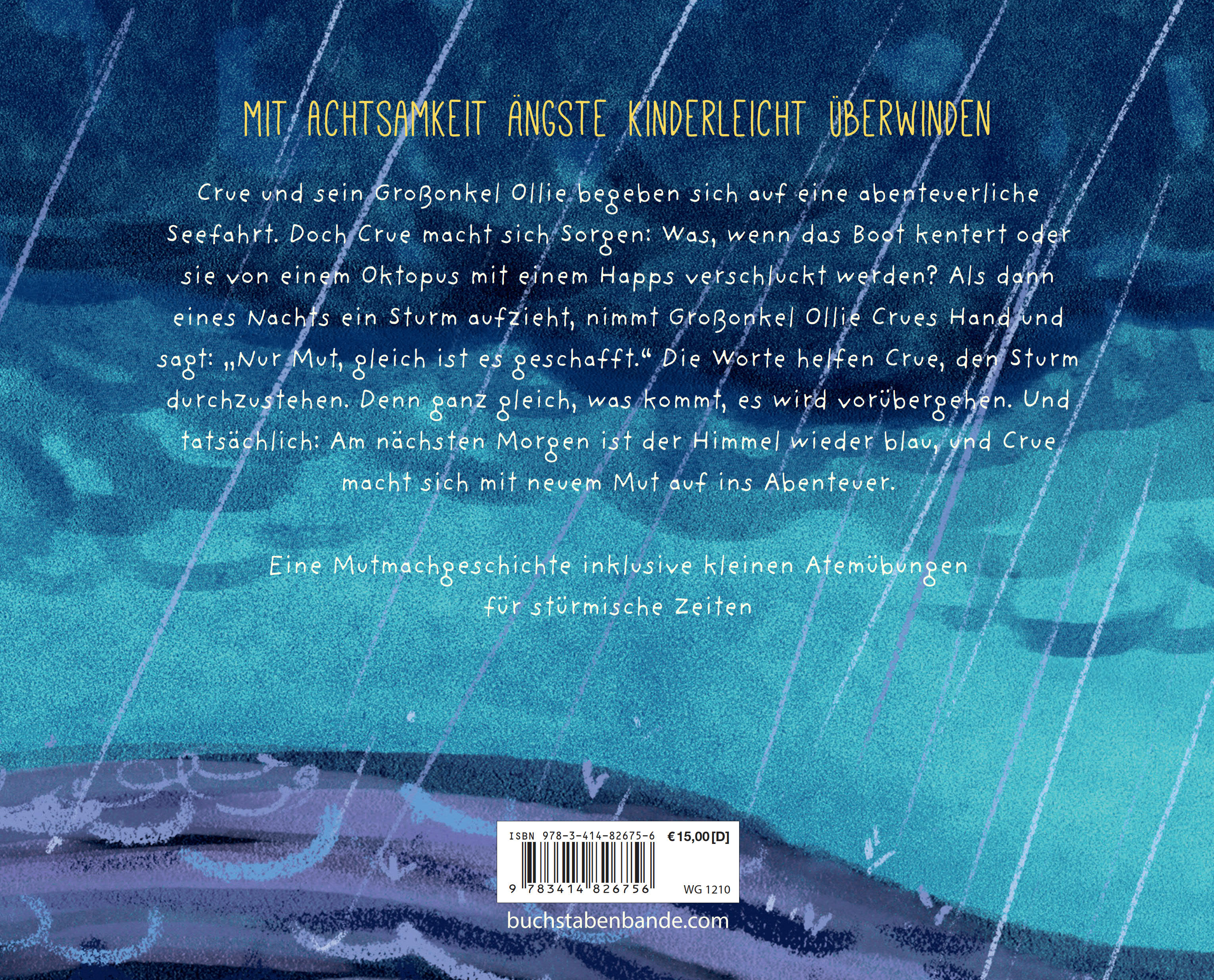 Crue und sein Großonkel Ollie begeben sich auf eine abenteuerliche Seefahrt. Doch Crue macht sich Sorgen: Was, wenn das Boot kentert oder sie von einem Oktopus mit einem Happs verschluckt werden? Als dann eines Nachts ein Sturm aufzieht, nimmt Großonkel Ollie Crues Hand und sagt: "Nur Mut, gleich ist es geschafft." Die Worte helfen Crue, den Sturm durchzustehen. Denn ganz gleich, was kommt, es wird vorübergehen. Und tatsächlich: Am nächsten Morgen ist der Himmel wieder blau, und Crue macht sich mit neuem Mut auf ins Abenteuer.