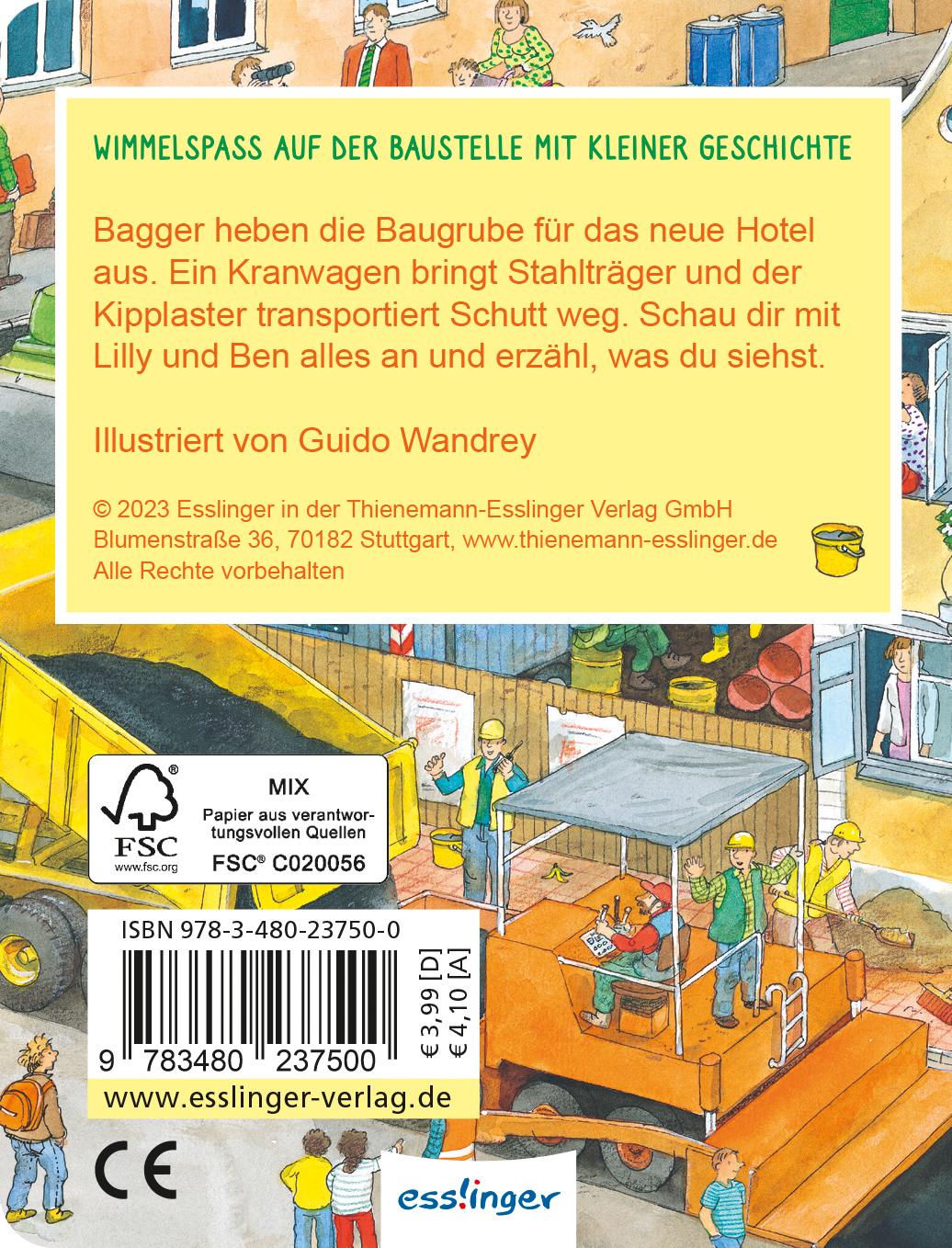 Wimmelspaß auf der Baustelle, mit kleiner Geschichte und Suchaufgaben: Lilly und Ben schauen den Bauarbeitern zu. Bagger heben die Baugrube für das neue Hotel aus. Ein Kranwagen bringt Stahlträger und der Kipplaster transportiert Schutt weg. Augen auf und los!