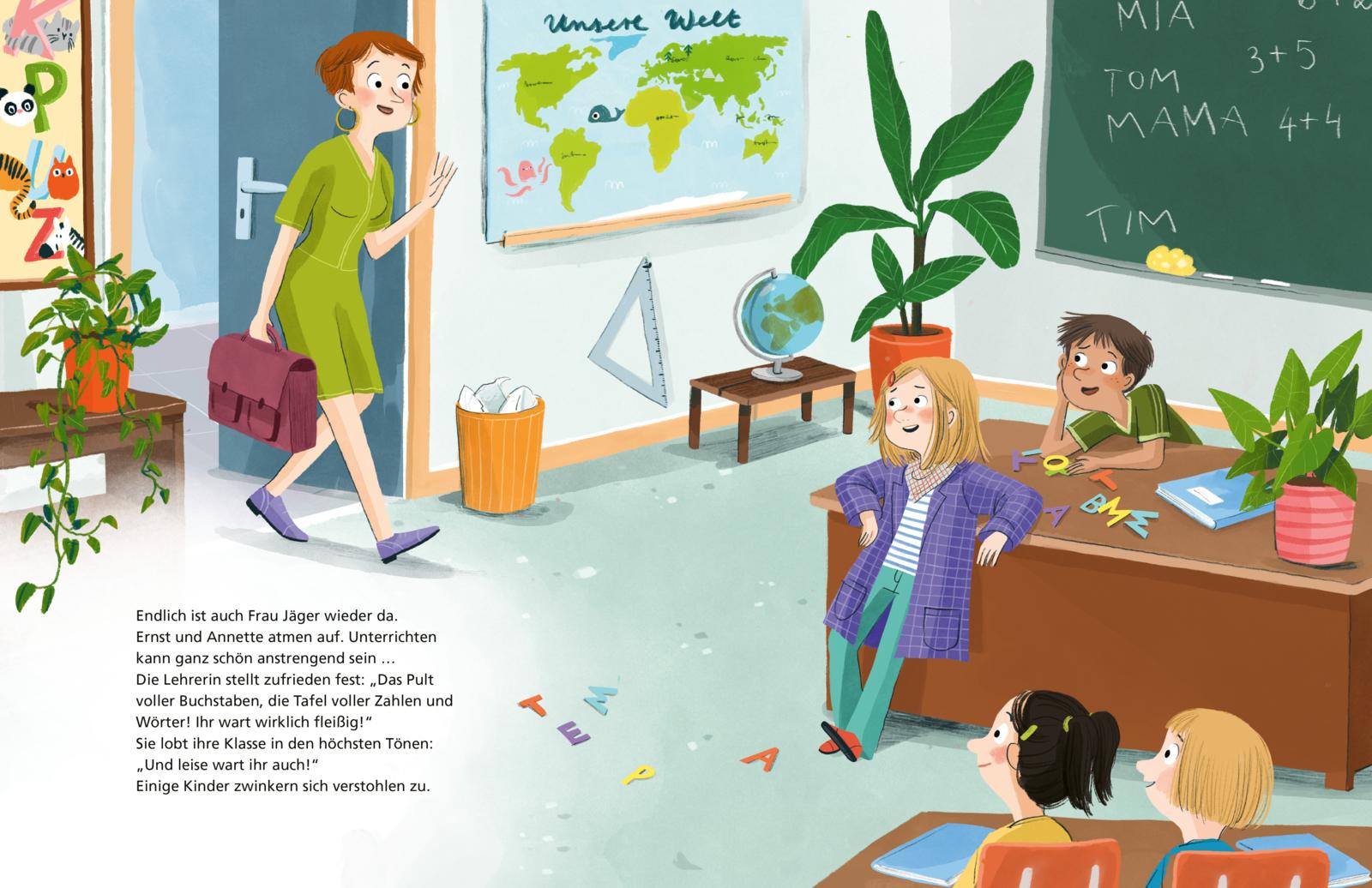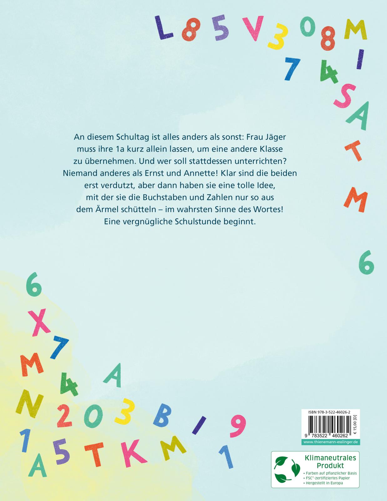 An diesem Schultag ist alles anders als sonst: Frau Jäger muss ihre 1A kurz allein lassen, um eine andere Klasse zu übernehmen. Und wer soll stattdessen unterrichten? Niemand anders als Ernst und Annette! Klar sind die beiden erst verdutzt, aber dann haben sie eine tolle Idee, mit der sie die Buchstaben und Zahlen nur so aus dem Ärmel schütteln - im wahrsten Sinne des Wortes! Eine vergnügliche Schulstunde beginnt.
